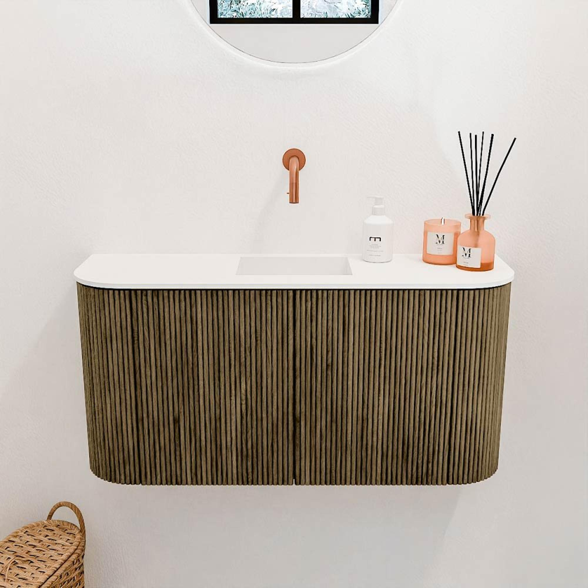 Le meuble se distingue immédiatement par sa structure verticale nervurée raffinée et ses courbes douces des deux côtés. Ces détails donnent à l’ensemble un aspect moderne et pourtant chaleureux qui s’intègre parfaitement à divers styles d’intérieur. La couleur Dusk ajoute une profondeur contemporaine et subtile, tandis que la vasque en Talc apporte une touche fraîche et claire. Ce jeu de couleurs et de formes fait du meuble un véritable point focal dans votre salle de bains. Grâce à la finition soignée et à l’utilisation de matériaux de haute qualité, le meuble dégage classe et élégance, offrant ainsi une véritable mise à niveau à votre salle de bains.