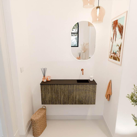 Avec une largeur de 100 cm, ce meuble offre suffisamment d'espace de rangement pour garder tous vos accessoires de salle de bains bien organisés. La vasque est positionnée à droite et ne comporte pas de trou de robinet, vous laissant le choix d'un robinet qui correspond parfaitement à votre style et à vos souhaits. Cela rend le meuble flexible et adaptable à vos préférences personnelles. Ainsi, vous créez une salle de bains qui n'est pas seulement belle, mais qui correspond parfaitement à votre routine quotidienne.