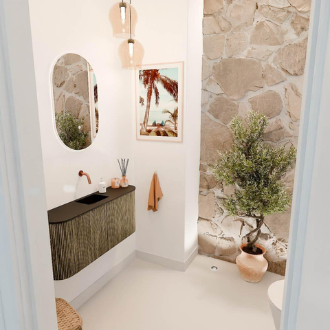 Transformez votre salle de bains ou toilette d'invités avec ce magnifique meuble qui est non seulement pratique, mais qui apporte aussi une ambiance chaleureuse et naturelle. Grâce aux arrondis subtils des deux côtés, l'espace gagne une atmosphère douce et accueillante. Le meuble combine un design moderne avec des matériaux de haute qualité, ce qui en fait un véritable point focal. L'association de la couleur profonde Dusk à l'avant et de la teinte Urban sur les côtés offre un look élégant et contemporain qui s'adapte facilement à divers styles d'intérieur. La vasque, placée au centre et sans trou de robinet, vous offre la liberté de choisir le robinet qui correspond le mieux à vos souhaits. Ainsi, vous créez une salle de bains entièrement sur mesure, avec une attention aux détails et au confort.