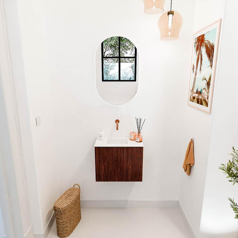 Avec une largeur de 50 cm et une profondeur de 24,5 cm, ce meuble est idéal pour les petites salles de bains ou toilettes d'invités où l'espace est limité. La vasque est placée à gauche, ce qui assure une disposition pratique et plus de liberté de mouvement. Le meuble offre suffisamment de rangement pour garder vos articles de toilette hors de vue, ce qui maintient votre salle de bains toujours ordonnée. De plus, le meuble est fixé au mur, facilitant le nettoyage du sol et créant une sensation d'espace. L'absence de trous de robinet vous permet de choisir vous-même le robinet qui correspond le mieux à votre style et à vos besoins.