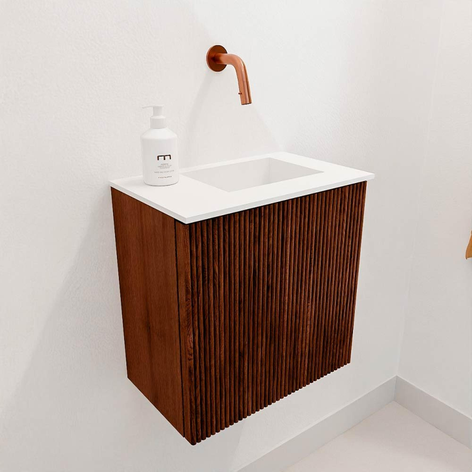 La combinaison de chêne massif à l'avant et de placage chêne sur les côtés offre une apparence naturelle et chaleureuse qui donne immédiatement du caractère à votre salle de bains. La couleur Ruby est profonde et intense, ce qui confère au meuble un aspect luxueux tout en restant accessible. Ce meuble s’intègre facilement dans des intérieurs modernes comme classiques et ajoute une touche raffinée sans dominer. Grâce à son design subtil et à ses matériaux de haute qualité, le meuble est non seulement agréable au toucher, mais il dégage aussi une qualité que vous apprécierez chaque jour.