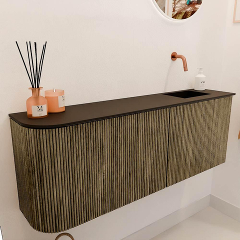 Le meuble se distingue immédiatement par la combinaison élégante de façades en chêne massif et de placage chêne sur les côtés, finis dans la couleur chaude Dusk. Ces matériaux naturels confèrent un aspect luxueux et intemporel qui s'intègre facilement dans les salles de bains modernes comme classiques. Le subtil arrondi sur le côté gauche ajoute un détail ludique, donnant au meuble un caractère unique. Ainsi, vous créez une salle de bains qui est non seulement fonctionnelle, mais aussi un véritable point de mire.