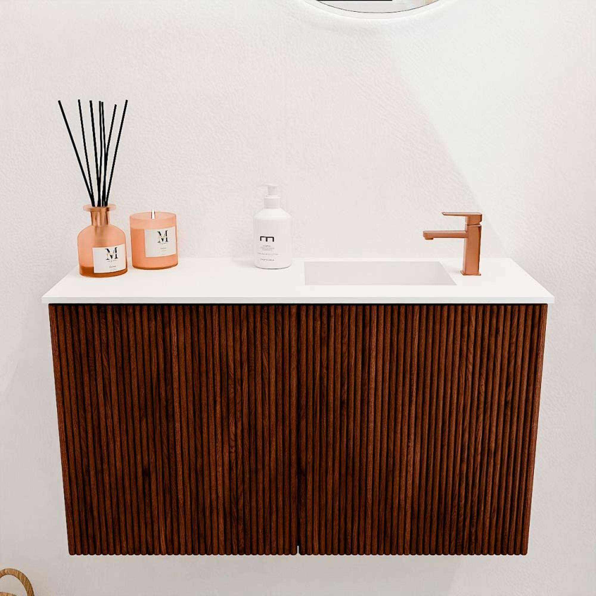 La couleur Ruby frappante et la façade cannelée de ce meuble donnent à votre salle de bains une apparence unique et élégante. L'utilisation du chêne massif à l'avant crée une atmosphère chaleureuse et naturelle que vous ne trouverez pas facilement dans les meubles de salle de bains standards. La structure subtile du grain et le placage fin sur les côtés complètent l'ensemble. Ainsi, vous ajoutez non seulement un élément fonctionnel, mais aussi une pièce de design qui élève votre salle de bains à un niveau supérieur. Grâce à la combinaison de la couleur et du matériau, ce meuble s'adapte parfaitement aux salles de bains modernes comme classiques.