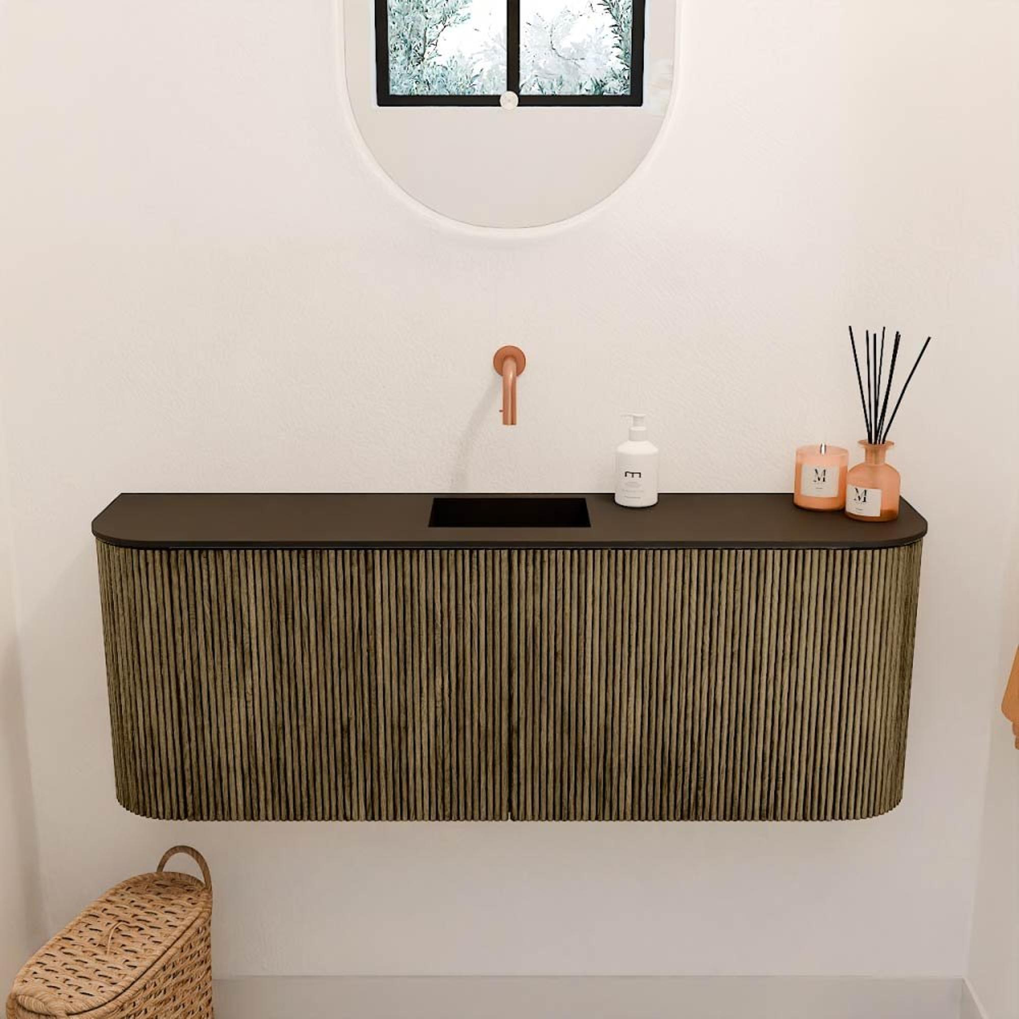 Le meuble se distingue immédiatement par la structure nervurée élégante sur les façades et les courbes subtiles des deux côtés. La couleur Dusk donne à l'ensemble une apparence chaude et naturelle qui dégage calme et confort. En combinaison avec la vasque de couleur Urban, un beau contraste se crée qui donne à votre salle de bains une ambiance moderne et pourtant intemporelle. Ce design a été soigneusement choisi pour donner à votre salle de bains une apparence luxueuse sans dominer. Vous créez ainsi un espace invitant à la détente et dont vous pouvez être fier.