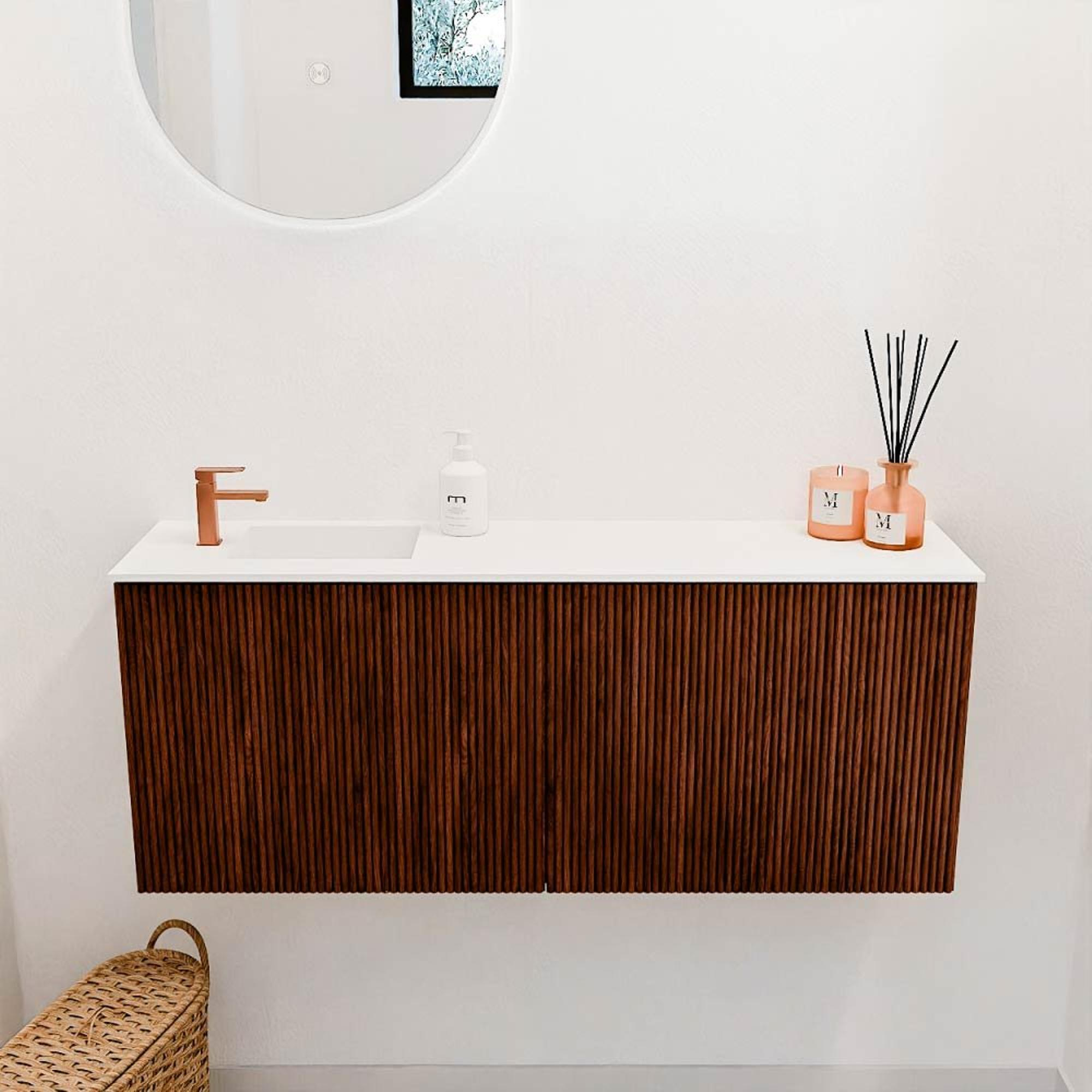 La combinaison de la couleur chaude Ruby avec l'aspect naturel du chêne massif rend ce meuble particulièrement élégant. La structure rainurée sur les façades ajoute un détail subtil qui donne à l'ensemble un look moderne et pourtant intemporel. Vous créez ainsi une salle de bains qui n'est pas seulement fonctionnelle, mais aussi un endroit où vous aimez passer du temps. Le design s'adapte parfaitement à divers styles d'intérieur, du classique au contemporain, ce qui en fait un choix polyvalent pour toute salle de bains.