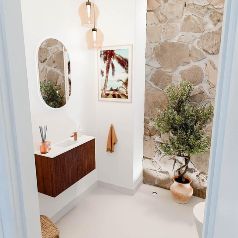 Avec ce magnifique meuble, vous donnez immédiatement à votre salle de bains une ambiance chaleureuse et élégante. Il combine une couleur Ruby raffinée avec une vasque subtile Talc, ce qui en fait un véritable point focal dans chaque pièce. Grâce à ses dimensions compactes de 70 cm de large, il s'adapte parfaitement aussi bien aux petites qu'aux grandes salles de bains. L'association de chêne massif à l'avant et de placage chêne sur les côtés assure non seulement un aspect naturel et luxueux, mais aussi une construction durable et solide. Ce meuble facilite l'organisation de votre salle de bains de manière simple et claire, tout en ajoutant une sensation de calme et d'élégance. Avec un seul trou de robinet au centre, il est en outre idéal pour divers robinets, vous permettant de personnaliser l'ensemble selon vos souhaits. La fixation murale offre un look moderne et flottant qui agrandit visuellement l'espace et facilite grandement le nettoyage. Ainsi, vous profitez chaque jour d'une salle de bains fonctionnelle et agréable où vous aimez passer du temps.