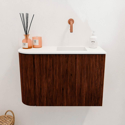 La couleur Ruby frappante donne au meuble une apparence chaleureuse et accueillante qui s'intègre parfaitement dans les salles de bains modernes et contemporaines. L'arrondi subtil sur le côté gauche crée un accent de design unique qui attire immédiatement le regard. La combinaison avec la vasque Talc crée un beau contraste qui donne à votre salle de bains une touche exclusive. Ce meuble n'est pas seulement un élément fonctionnel, mais aussi une pièce maîtresse élégante qui reflète votre goût personnel. Ainsi, vous profitez chaque jour d'une salle de bains à la fois belle et particulière.