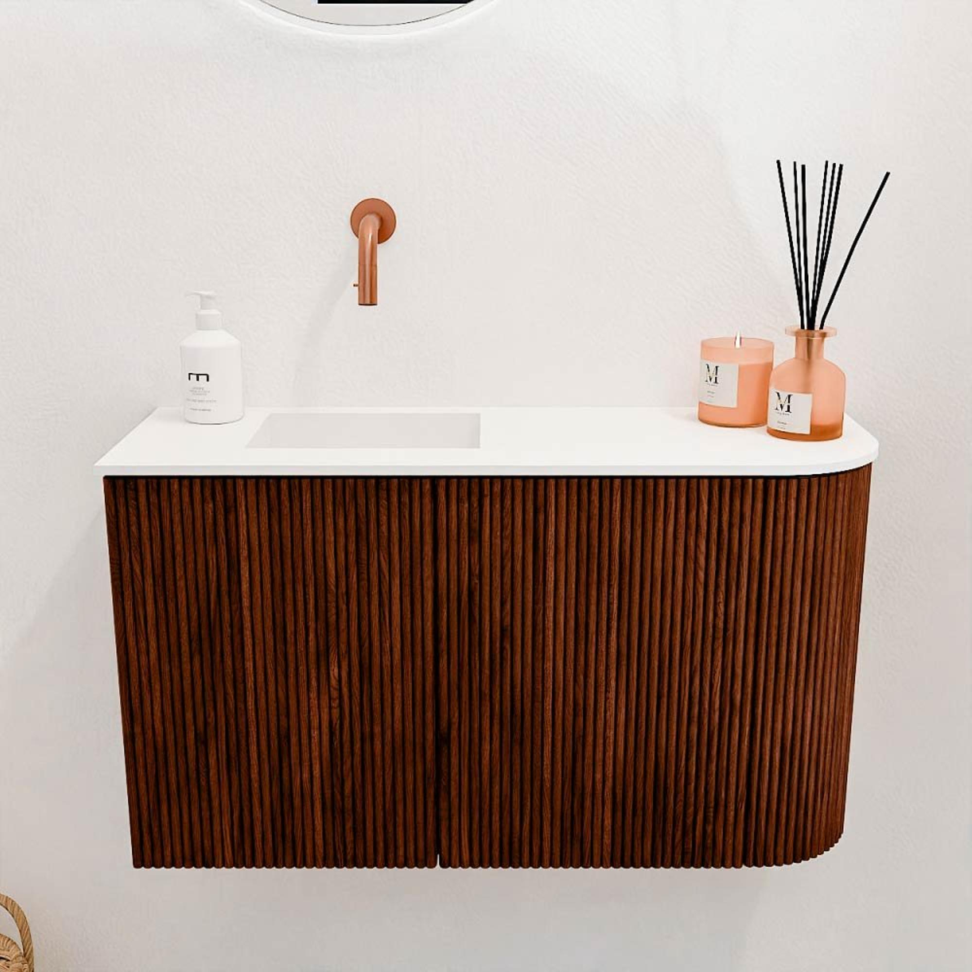 Ce meuble se distingue immédiatement par son design élégant avec un côté droit arrondi et une façade en chêne massif à structure nervurée verticale. La couleur chaude Ruby donne à l'ensemble une apparence exclusive qui s'intègre facilement dans les salles de bains modernes comme classiques. La combinaison des tons naturels du bois et d'un design épuré crée un meuble intemporel qui confère à votre salle de bains une ambiance unique et accueillante. Le meuble est un véritable point focal qui apporte une touche personnelle à votre salle de bains tout en dégageant calme et harmonie.