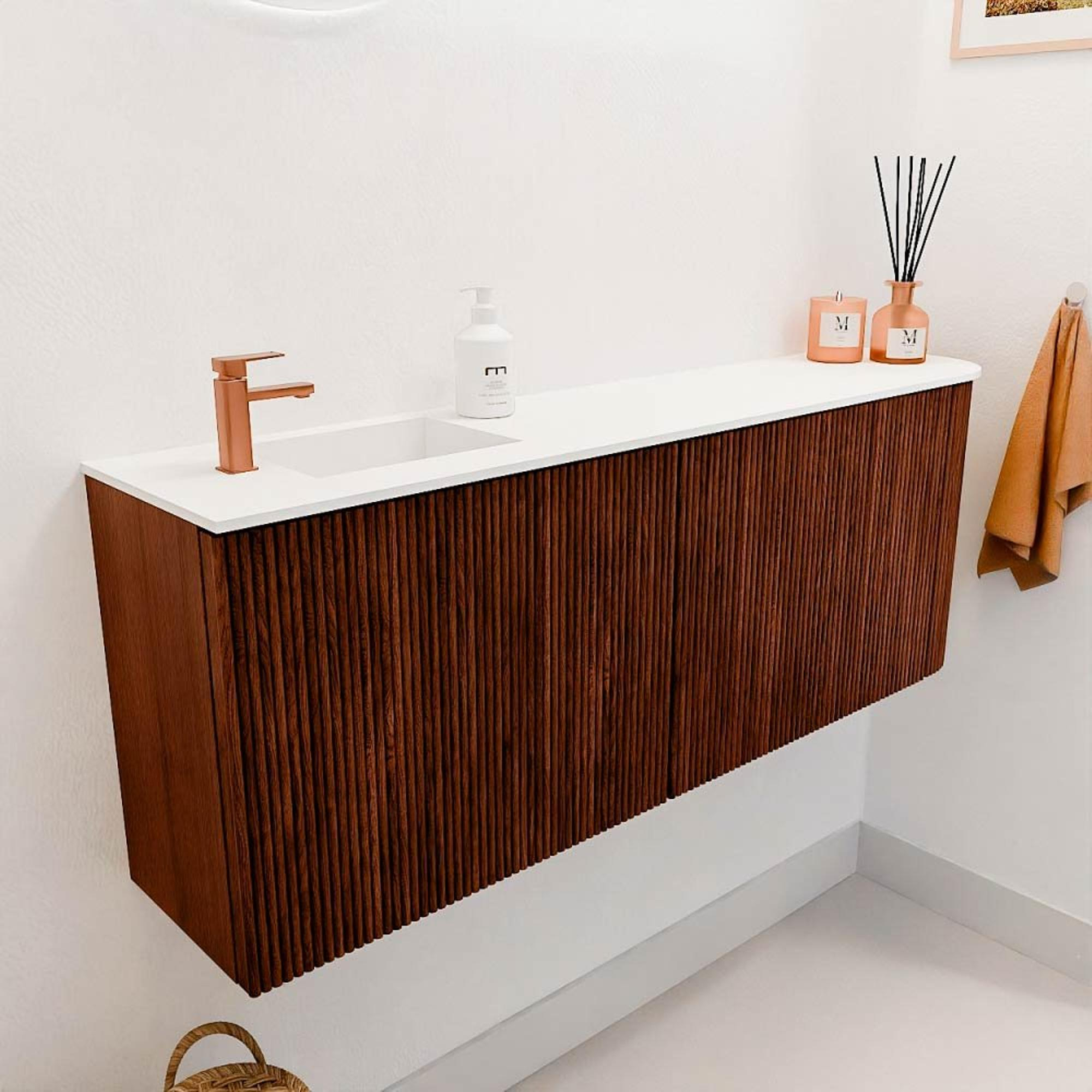 La combinaison de chêne massif à l'avant et de placage chêne sur les côtés confère à ce meuble un aspect naturel et luxueux. La couleur chaude Ruby apporte un accent chaleureux dans votre salle de bains, tandis que la forme arrondie sur le côté droit donne au design une touche douce et accueillante. Ce meuble est un choix parfait si vous recherchez un meuble de salle de bains qui soit non seulement fonctionnel, mais aussi un véritable élément de décoration. Grâce aux matériaux de haute qualité et au design réfléchi, vous ajoutez un élément élégant qui durera des années.