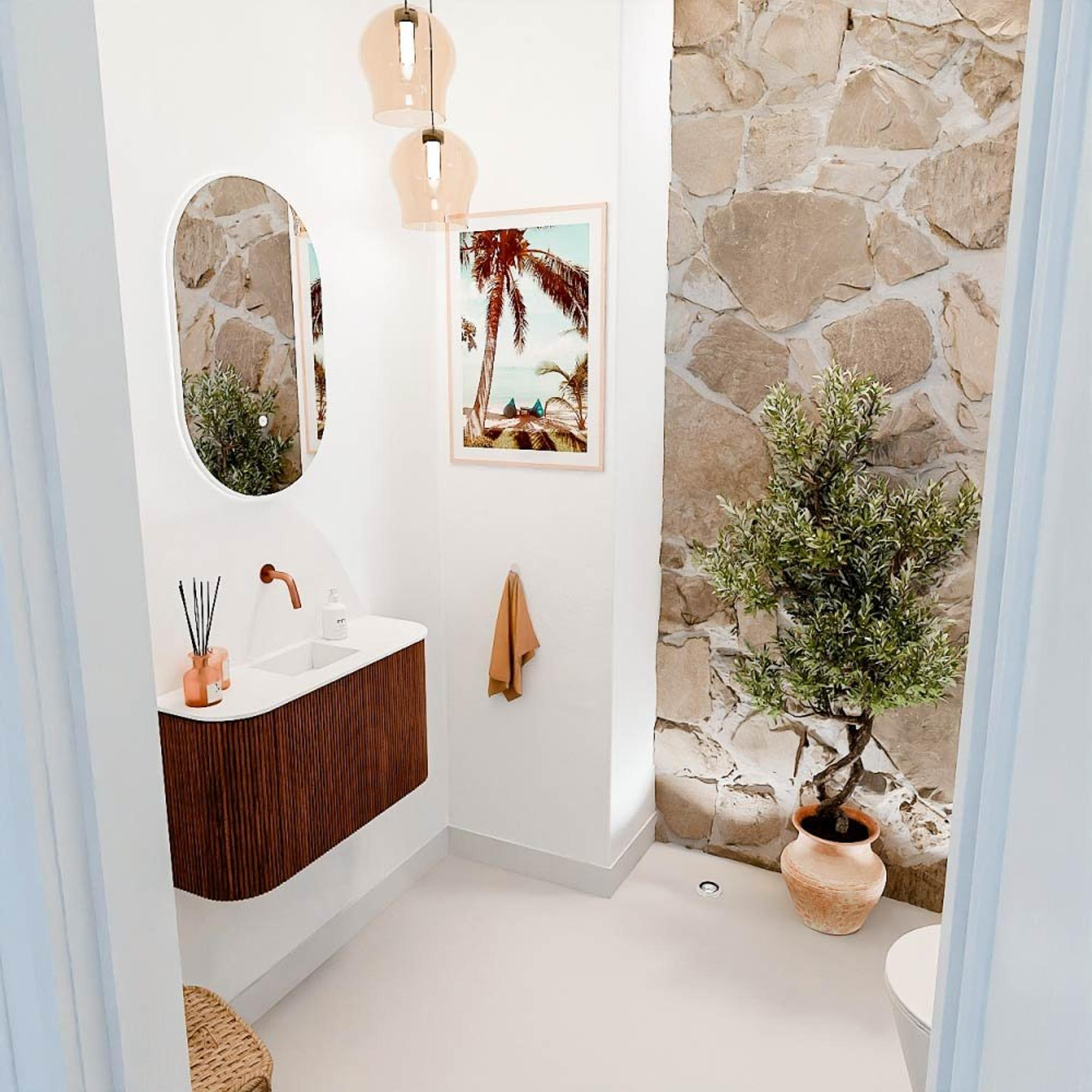Transformez votre salle de bains avec ce magnifique meuble qui est non seulement fonctionnel, mais aussi un véritable élément décoratif. Il combine des matériaux naturels avec un design moderne, donnant immédiatement à votre salle de bains une ambiance chaleureuse et élégante. Grâce à la finition arrondie subtile sur les deux côtés, le meuble est doux et accueillant au toucher, tandis que ses dimensions généreuses offrent un espace de rangement suffisant. La vasque sans trou de robinet vous donne la liberté de choisir le robinet idéal, afin que tout corresponde parfaitement à vos souhaits et à votre style. Avec ce meuble, vous créez un équilibre harmonieux entre fonctionnalité pratique et apparence raffinée, faisant de votre salle de bains un lieu où vous commencez et terminez chaque jour avec plaisir.