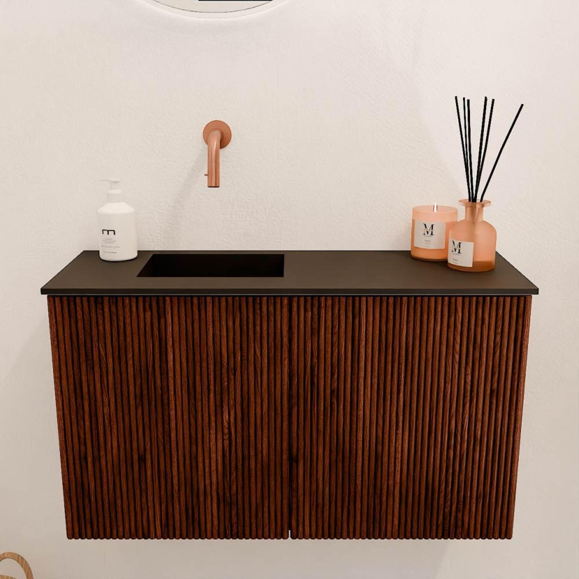 Les rainures verticales sur la façade donnent au meuble un aspect contemporain et raffiné qui attire immédiatement l'attention. La couleur Ruby apporte une ambiance chaleureuse et accueillante, tandis que l'accent Urban ajoute une touche subtile et moderne. Ce meuble est un véritable point fort qui donne à votre salle de bains une apparence unique et personnelle. Grâce à son design intemporel, il s'harmonise facilement avec différents styles d'intérieur, du moderne épuré au chaleureux classique.