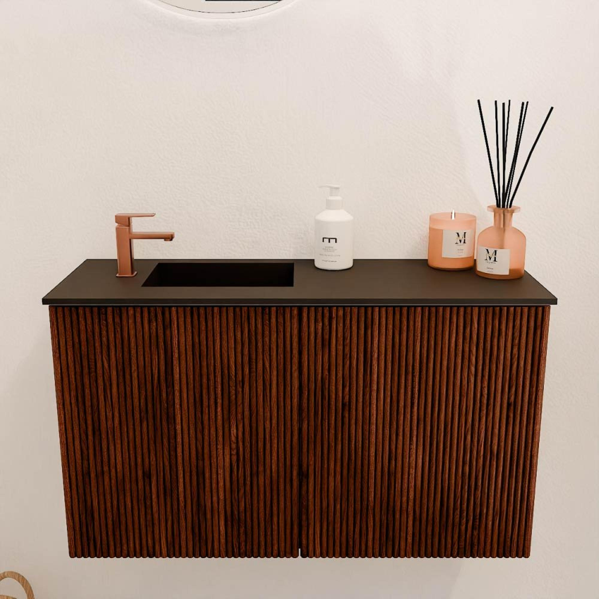 La couleur Ruby frappante du meuble donne immédiatement du caractère et de la chaleur à votre salle de bains. Le motif côtelé sur la façade apporte une texture subtile qui confère un aspect luxueux à l'ensemble. La combinaison avec la vasque gris Urban crée un contraste moderne qui reste harmonieux. Ce meuble est conçu pour être un véritable point focal, sans dominer. Vous ajoutez ainsi un élément unique à votre salle de bains, à la fois intemporel et tendance. Le design élégant facilite la combinaison du meuble avec différents styles de salle de bains, du moderne au classique.