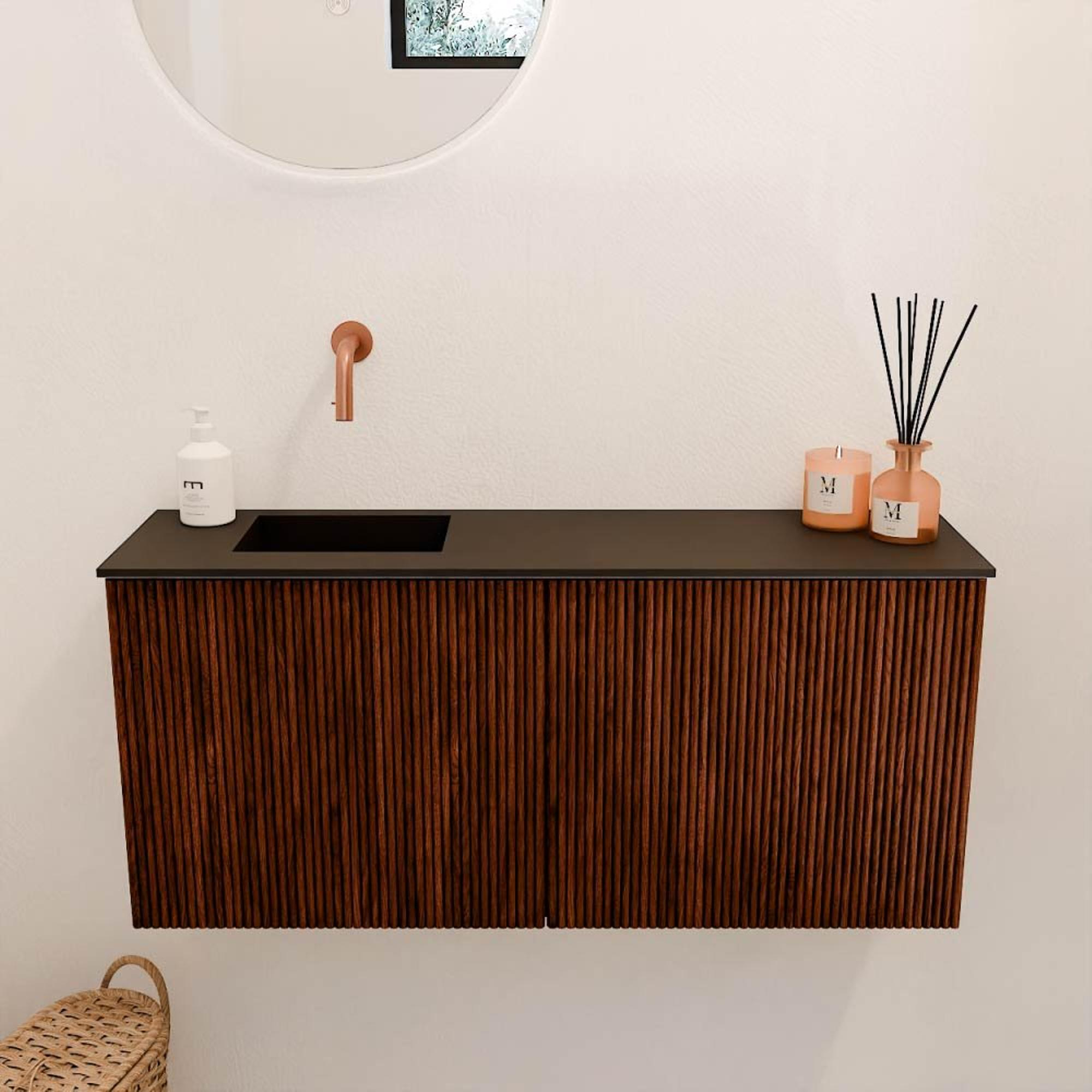 Le meuble se distingue immédiatement par la façade cannelée élégante de couleur Ruby, qui crée une atmosphère naturelle et intemporelle. La combinaison de chêne massif et de placage de chêne sur les côtés donne à l'ensemble un aspect luxueux qui convient parfaitement aux salles de bains modernes comme classiques. Grâce aux détails subtils et au savoir-faire de haute qualité, votre salle de bains devient un lieu où style et confort se rencontrent. Ce meuble est un véritable point fort qui élève votre intérieur à un niveau supérieur.