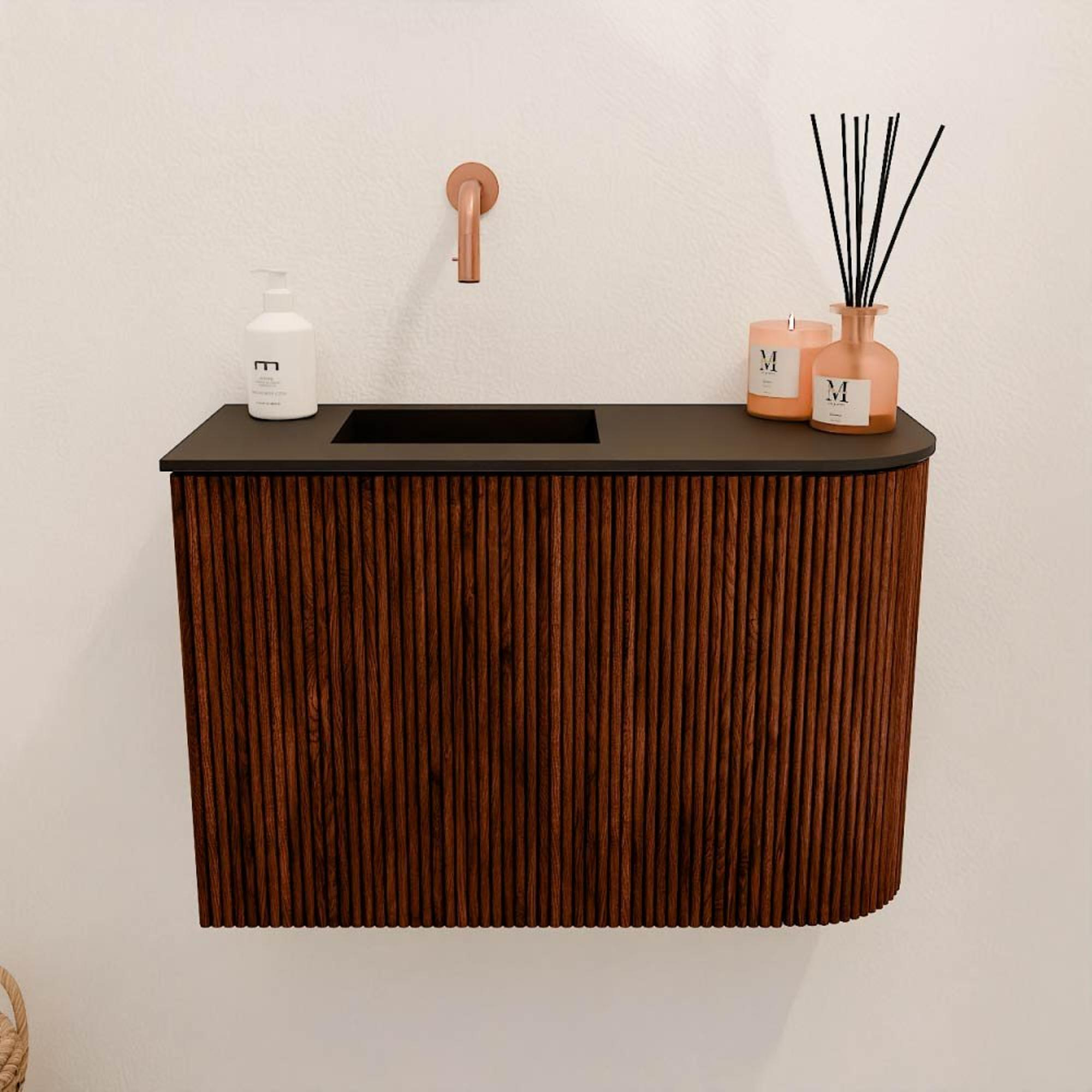 Avec son arrondi unique sur le côté droit et les nervures verticales remarquables, ce meuble attire immédiatement l'attention. La couleur Ruby chaude donne à l'ensemble une apparence riche et accueillante, tandis que le lavabo Urban positionné à gauche offre un contraste subtil. Ce meuble est conçu pour donner à vos toilettes un look moderne et raffiné, qui s'harmonise facilement avec divers styles d'intérieur. La combinaison du design et de la couleur crée un ensemble harmonieux qui apporte ce petit plus à votre salle de bains. Vous profitez ainsi non seulement de la fonctionnalité, mais aussi d'une pièce maîtresse élégante dont vous pouvez être fier.