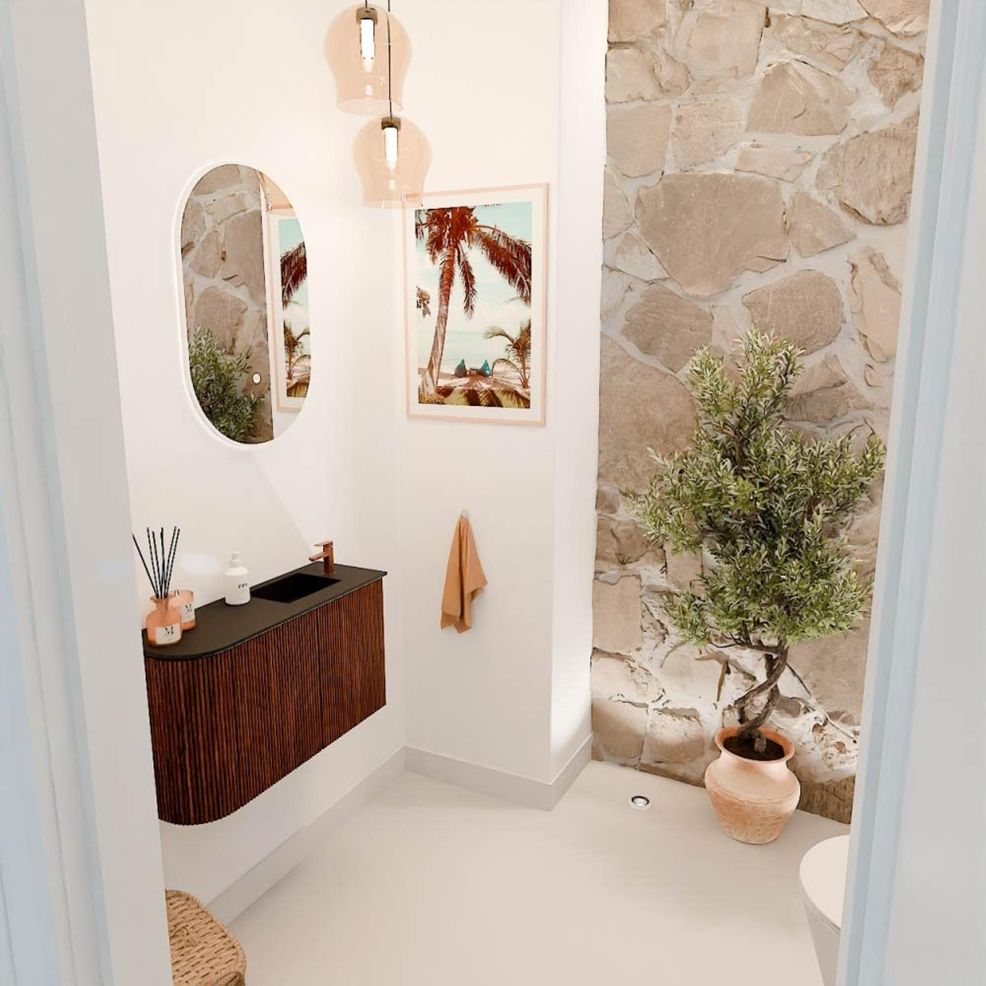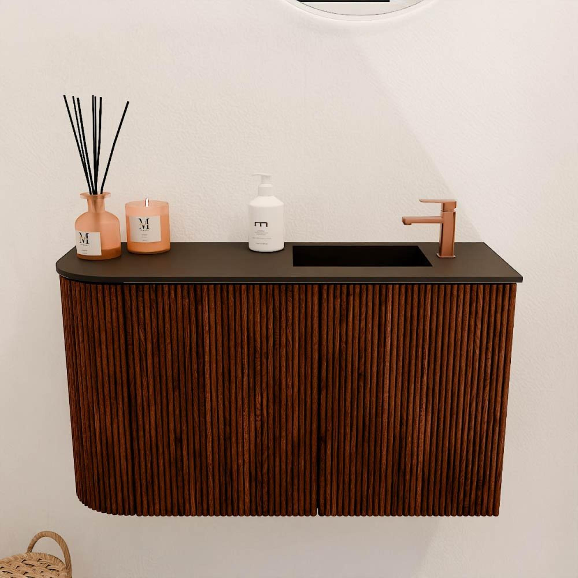 La combinaison de la couleur Ruby rouge profond avec la vasque moderne Urban crée un ensemble remarquable et élégant. Le meuble présente une structure nervurée à l’avant qui joue subtilement avec la lumière et l’ombre, ce qui donne un effet ludique mais raffiné. Cela fait du meuble un véritable point focal dans votre salle de bains. La forme arrondie sur le côté gauche donne au design une apparence douce et accueillante qui s’accorde parfaitement avec une décoration de salle de bains chaleureuse et personnelle. Vous ajoutez ainsi non seulement de la fonctionnalité, mais aussi un élément élégant qui complète votre salle de bains.