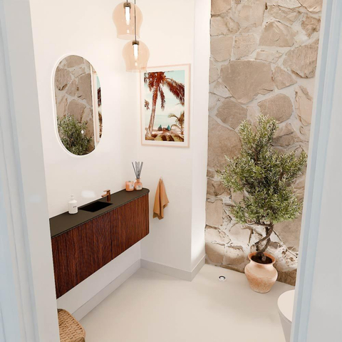 Le meuble se distingue immédiatement par son apparence élégante. La structure à nervures verticales sur les panneaux avant lui confère une texture unique qui joue subtilement avec la lumière et l'ombre. La couleur chaude Ruby renforce cet effet et crée une ambiance chaleureuse dans votre salle de bains. L'utilisation de chêne massif à l'avant et de placage chêne sur les côtés confère au meuble un luxe naturel. Cela en fait non seulement un élément accrocheur, mais aussi un élément intemporel qui s'adapte facilement à différents styles d'intérieur. Vous profitez ainsi d'une salle de bains à la fois moderne et chaleureuse.