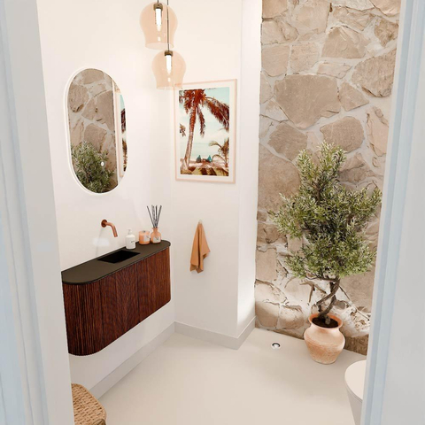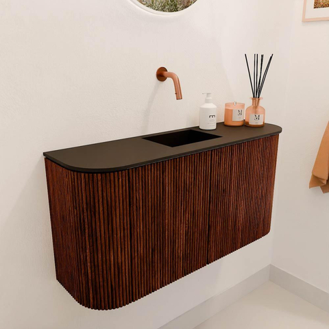 La combinaison de chêne massif et d'une couleur Ruby chaude crée un meuble qui attire immédiatement l'attention. La structure rainurée sur les façades donne une texture subtile qui confère au meuble du caractère et de la profondeur. Les bords arrondis des deux côtés rendent le design unique et assurent une ligne douce et fluide qui dégage calme et harmonie. Ce meuble est un véritable point de mire qui donne à votre salle de bains une apparence exclusive sans dominer. Grâce au design intemporel, il s'adapte facilement à différents styles d'intérieur, du moderne au classique.