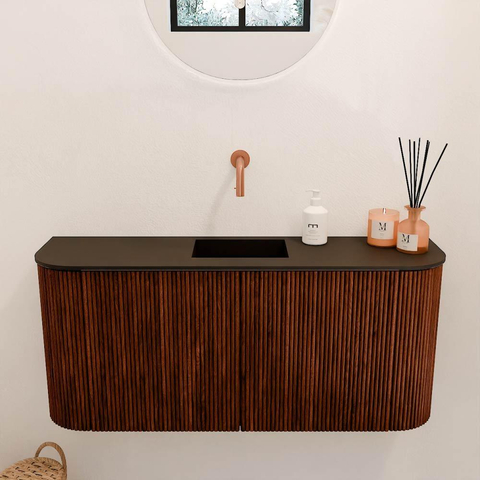 La combinaison d'une couleur Ruby chaude avec le chêne naturel donne à ce meuble une apparence unique et luxueuse. Les arrondis sur les côtés gauche et droit créent un effet ludique et élégant, faisant de ce meuble un véritable point focal dans votre salle de bains. Grâce à l'utilisation de chêne massif à l'avant et de placage de chêne sur les côtés, vous profitez d'un aspect bois authentique qui ne fait que s'embellir avec le temps. Ce meuble ajoute immédiatement du caractère et de l'ambiance, faisant de votre salle de bains un endroit où vous aimez passer du temps.