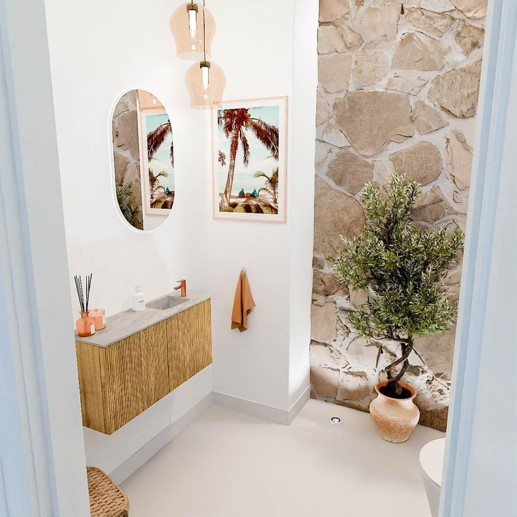 Avec ce magnifique meuble, vous donnez immédiatement à votre salle de bains ou toilettes d'invités une ambiance chaleureuse et naturelle. Le format compact de 80 cm de large s'adapte parfaitement aux petits espaces, sans compromettre le style ou la fonctionnalité. La combinaison de chêne massif à l'avant et de placage chêne sur les côtés assure un look intemporel et durable qui dure des années. La vasque dans une subtile couleur glace avec un trou de robinet à droite complète l'ensemble et offre une grande facilité d'utilisation. Ce meuble n'est pas seulement un ajout pratique, il transforme aussi votre espace en un lieu apaisant où vous commencez et terminez chaque jour avec plaisir. Grâce à la fixation murale, le meuble paraît léger et moderne, tout en offrant suffisamment d'espace de rangement derrière les deux portes. Ainsi, vous gardez votre salle de bains propre et organisée, sans faire de compromis sur le design.