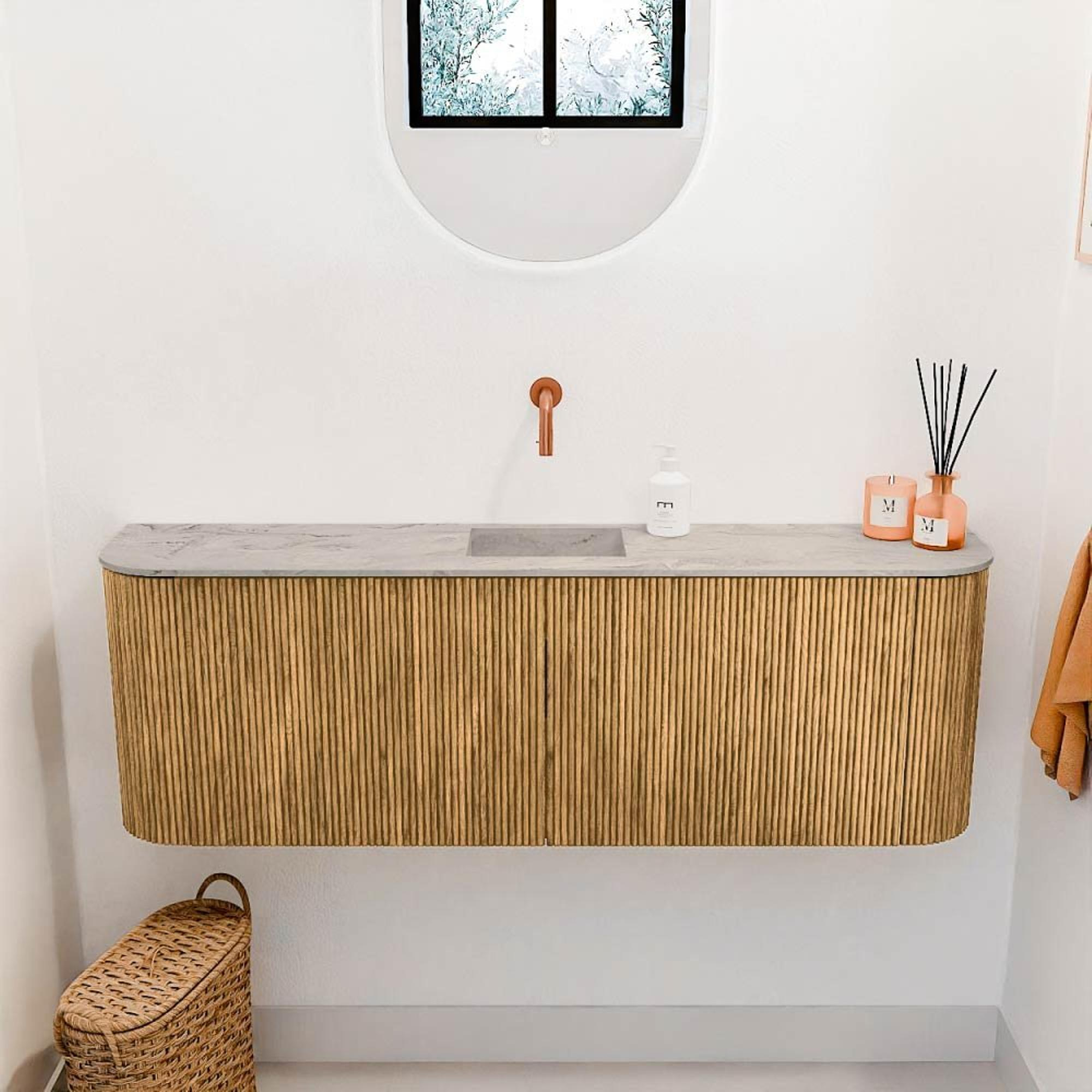 Avec ce magnifique meuble, vous donnez immédiatement à votre salle de bains ou WC une ambiance chaleureuse et naturelle. Il combine un design intemporel avec une fonctionnalité intelligente, ce qui le rend non seulement esthétique, mais aussi pratique à l'usage. Les courbes subtiles à la fois sur le côté gauche et droit offrent une forme douce et accueillante qui s'intègre parfaitement dans les intérieurs modernes. Grâce à la largeur généreuse de 123,2 cm, ce meuble offre suffisamment d'espace de rangement pour garder tous vos accessoires de salle de bains bien organisés et visibles. L'association du bois de chêne chaleureux et de la vasque claire et fraîche de couleur glace crée un ensemble harmonieux qui dégage calme et style. Grâce à la position centrale de la vasque sans trou de robinet, vous pouvez choisir vous-même le robinet qui correspond le mieux à vos souhaits, offrant ainsi une liberté supplémentaire dans l'aménagement. Ce meuble transforme votre salle de bains en un lieu où vous commencez et terminez chaque jour avec plaisir.
