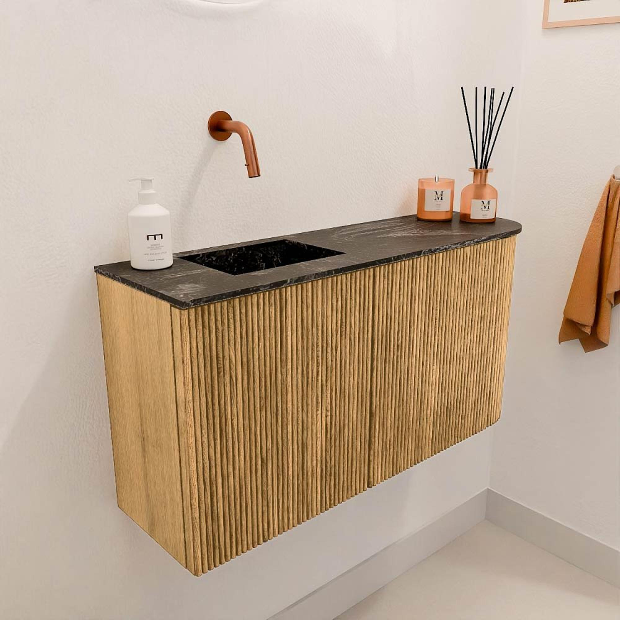 Le meuble est fabriqué avec des panneaux de façade en chêne massif, ce qui garantit une apparence naturelle et chaleureuse qui ne se démode jamais. La combinaison avec la vasque de couleur lava rend l'ensemble particulier et unique. Grâce aux lignes droites et à l'angle arrondi sur le côté droit, le meuble a une forme douce et accueillante qui s'intègre parfaitement dans les salles de bains modernes comme classiques. Avec ce meuble, vous optez pour un design qui est non seulement beau à voir, mais qui constitue aussi un véritable point fort dans votre salle de bains.