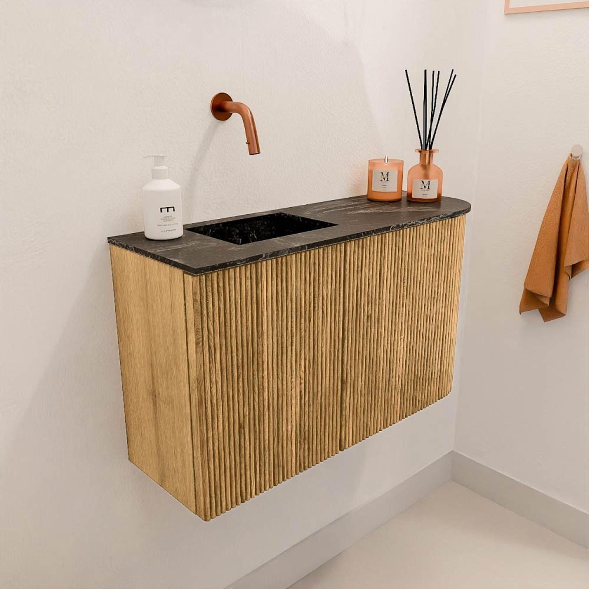La combinaison de bois de chêne massif et de placage de chêne sur les côtés donne à ce meuble une apparence naturelle et chaleureuse qui donne immédiatement du caractère à votre salle de bains. La structure verticale en relief sur les façades ajoute un détail subtil et moderne qui affine l'ensemble sans dominer. Grâce au côté droit arrondi, le meuble reçoit un accent unique et ludique, ce qui le distingue des meubles de salle de bains standards. Ce design élégant s'intègre facilement dans les salles de bains classiques comme modernes et assure que votre espace ait toujours une allure soignée et accueillante.