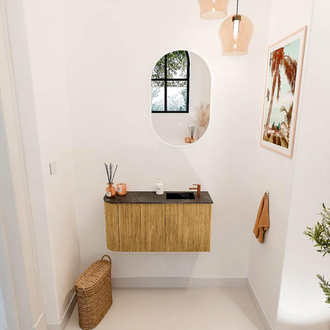 Le meuble se distingue immédiatement par son élégant arrondi à gauche et la couleur chaude chêne qui donne un aspect naturel. Cela crée un design intemporel qui s'adapte facilement à différents styles d'intérieur, du moderne au classique. La vasque couleur lava ajoute un élément robuste et contemporain, donnant à l'ensemble une apparence unique. Ainsi, vous créez une salle de bains ou un toilette qui n'est pas seulement pratique, mais qui impressionne aussi vraiment vos invités.