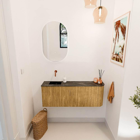 Ce meuble attire immédiatement l'attention par son design élégant et ses matériaux de haute qualité. La combinaison de bois de chêne massif à l'avant et de placage chêne sur les côtés assure une apparence naturelle et chaleureuse qui s'intègre parfaitement dans divers styles d'intérieur. L'arrondi subtil sur le côté droit donne au meuble un caractère unique et en fait un véritable point de mire. Grâce aux lignes épurées et à la palette de couleurs soigneusement choisie entre Chêne et Lava, vous ajoutez sans effort une touche de luxe à votre salle de bains. Ainsi, vous profitez non seulement d'un meuble fonctionnel, mais aussi d'un ajout stylé qui complète votre salle de bains.