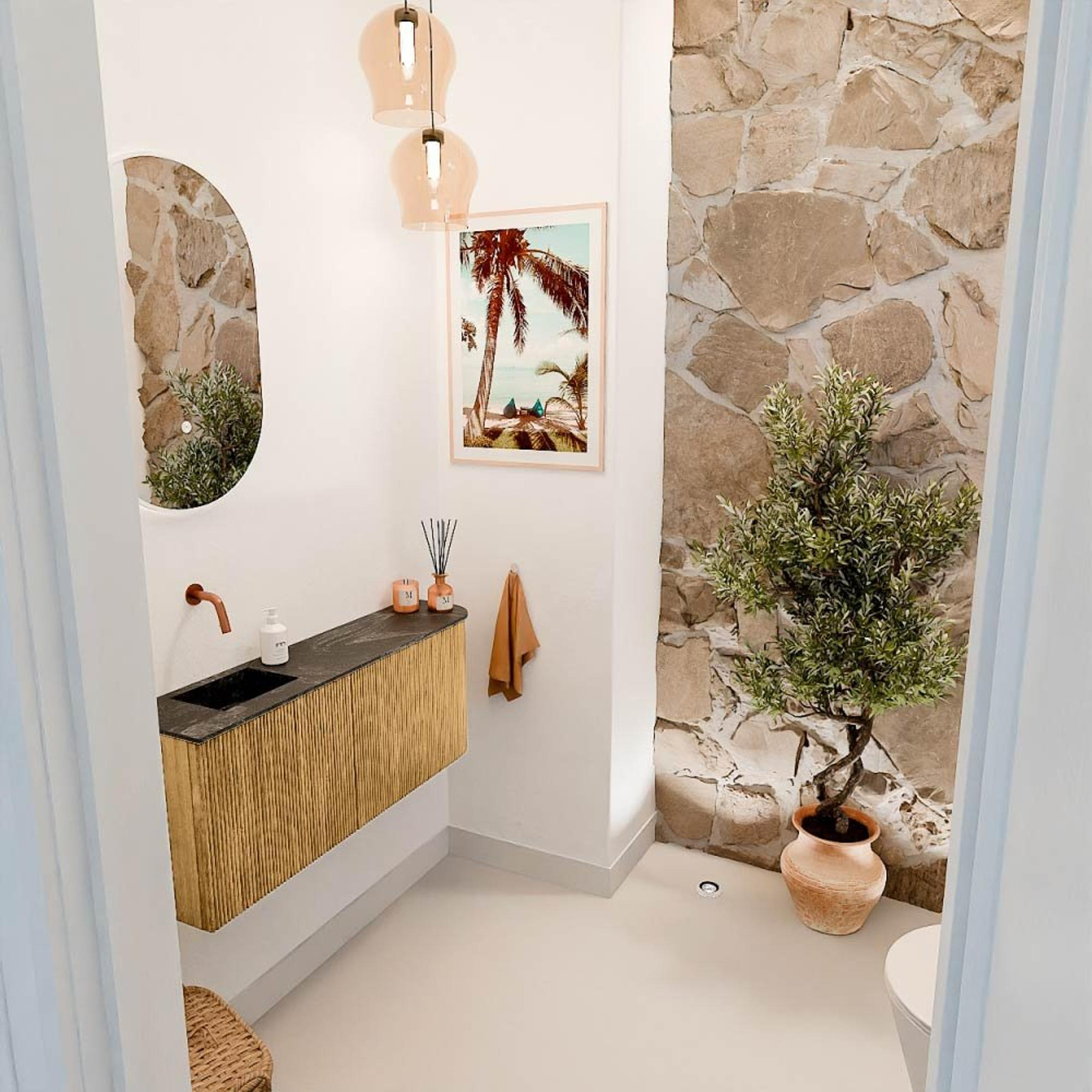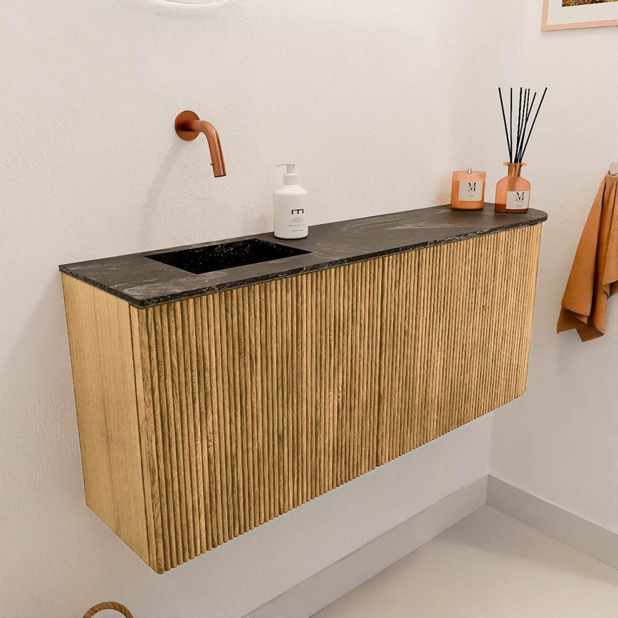Ce meuble attire immédiatement l'attention par son apparence élégante. Les façades en chêne massif avec rainures verticales lui confèrent un look naturel et raffiné qui s'harmonise sans effort avec différents styles de salle de bains. La couleur chaude Oak crée une ambiance intemporelle, tandis que l'arrondi subtil sur le côté droit donne un accent ludique et moderne à l'ensemble. La vasque en Lava ajoute un contraste robuste, faisant du meuble un véritable point focal. Grâce à ce design réfléchi, vous profitez d'une salle de bains qui est non seulement belle à voir, mais qui invite également à la détente et au confort.