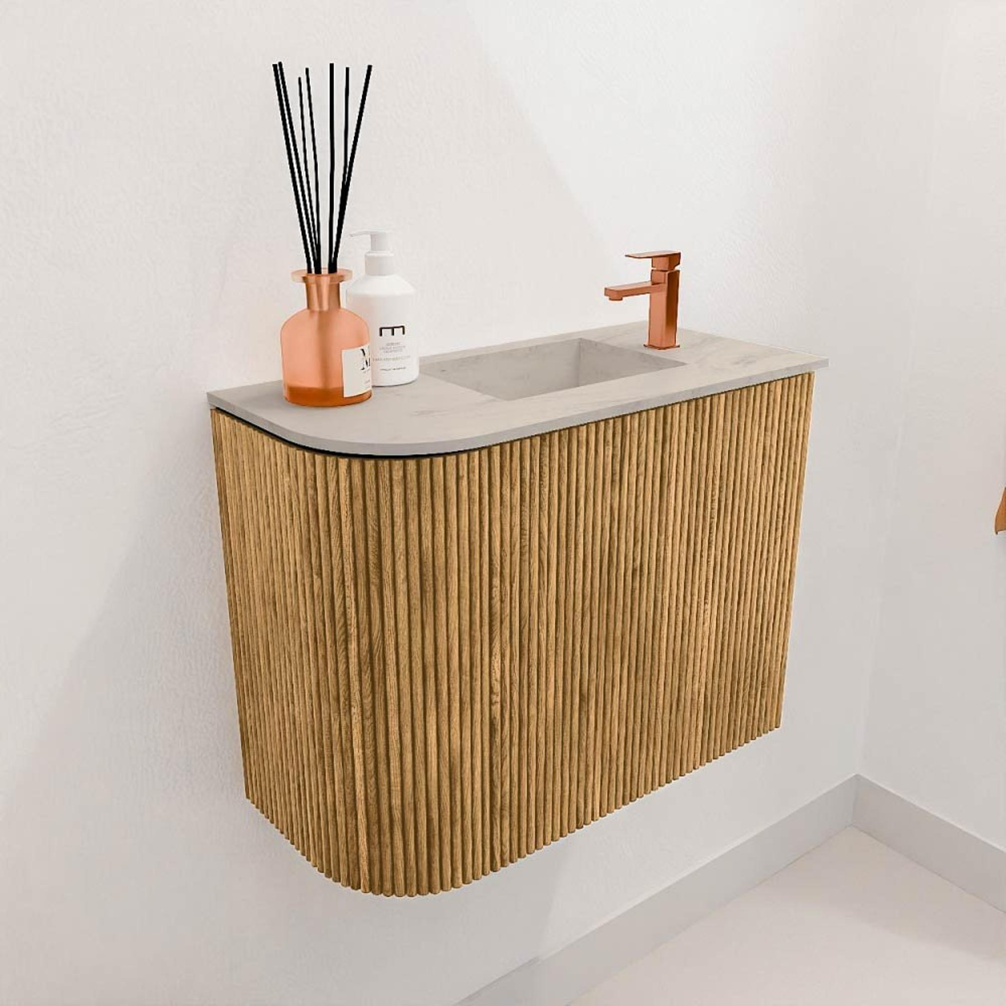 La chaude couleur chêne et les rainures verticales donnent à ce meuble une apparence unique qui est à la fois moderne et intemporelle. Grâce au subtil arrondi sur le côté gauche, le meuble acquiert un caractère ludique et doux, ce qui en fait immédiatement un point focal dans votre salle de bains. Le design est soigneusement adapté aux intérieurs contemporains, ce qui lui permet de s'harmoniser facilement avec différents styles. Ainsi, vous créez un espace harmonieux et accueillant où vous commencez chaque jour avec plaisir.