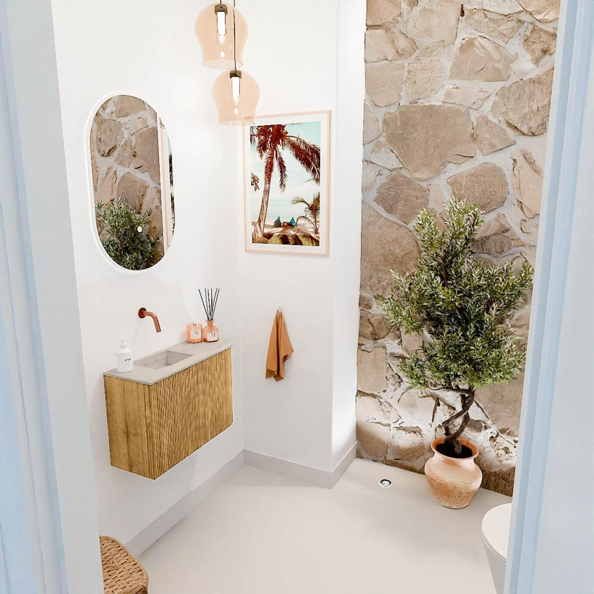 Avec ce magnifique meuble, vous donnez immédiatement à votre salle de bains une ambiance chaleureuse et naturelle. Le format compact de 61,6 cm de large le rend idéal pour les petits espaces, sans compromettre le style ou la fonctionnalité. L'arrondi subtil sur le côté droit apporte un détail ludique et moderne, tandis que la combinaison de bois de chêne et d'une vasque épurée de couleur Opalo crée une atmosphère intemporelle. Grâce à la vasque positionnée à gauche sans trou de robinet, vous choisissez vous-même le robinet qui correspond le mieux à votre style et à vos souhaits. Ce meuble apporte non seulement calme et élégance à votre salle de bains, mais offre également un espace de rangement pratique pour garder vos essentiels bien organisés et à portée de main. Ainsi, vous profitez chaque jour d'une salle de bains ordonnée et accueillante où vous aimez passer du temps.