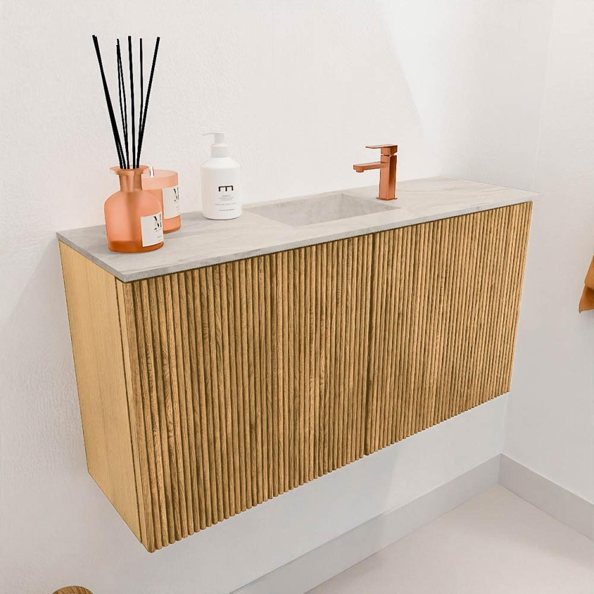 Ce meuble combine l'aspect chaleureux du chêne massif avec un design moderne grâce aux rainures verticales subtiles. La structure naturelle du bois crée une atmosphère authentique qui améliore immédiatement votre salle de bains. Grâce à la combinaison de chêne massif à l'avant et de placage chêne sur les côtés, vous bénéficiez d'un meuble non seulement magnifique, mais aussi d'une finition de haute qualité. Vous ajoutez ainsi un élément intemporel qui s'harmonise facilement avec différents styles d'intérieur, du moderne au classique.Durable