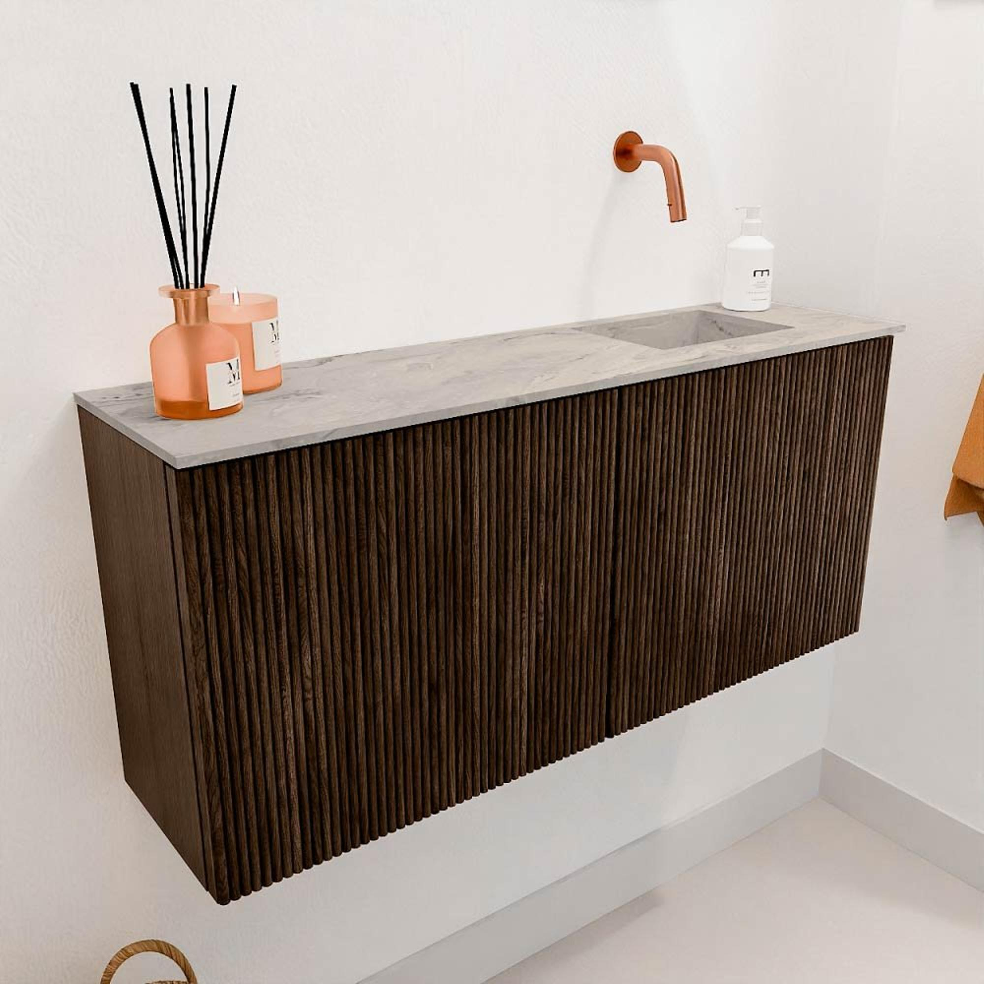 Avec sa couleur chaude Walnut et la vasque subtile Glace, ce meuble dégage une pure élégance. L'aspect bois naturel donne à votre salle de bains une ambiance authentique et accueillante, tandis que le design épuré apporte une touche moderne. Grâce à la position droite de la vasque, le meuble s'adapte parfaitement à votre espace, formant un ensemble harmonieux. Ce meuble élégant est un véritable point focal qui donne immédiatement un coup de neuf à votre espace toilettes. De plus, il s'intègre facilement à différents styles de salle de bains, vous assurant un élément intemporel et de bon goût dans votre intérieur.