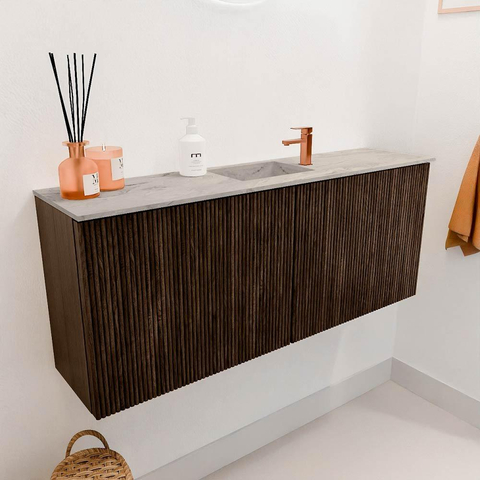 La couleur chaude noyer et la combinaison de chêne massif avec mélamine créent un meuble qui se distingue immédiatement par son apparence naturelle et luxueuse. Ce meuble s'intègre aisément dans des salles de bains modernes comme classiques. La subtile couleur glace de la vasque ajoute une nuance fraîche et claire, conférant à l'ensemble une élégance intemporelle. Grâce au design épuré à fixation murale, l'espace paraît en outre plus spacieux et ordonné. Vous profitez ainsi d'une salle de bains non seulement fonctionnelle, mais aussi véritablement remarquable.