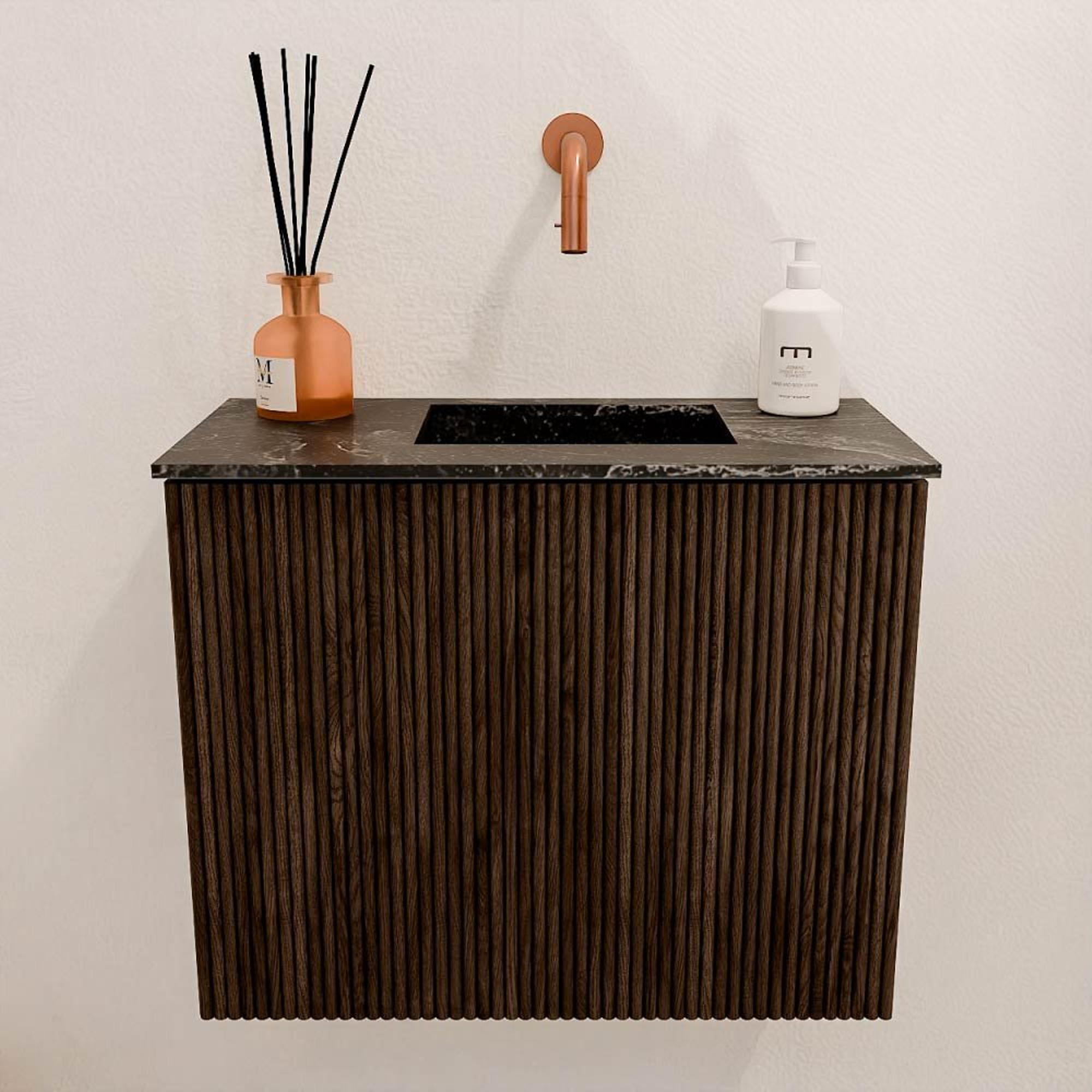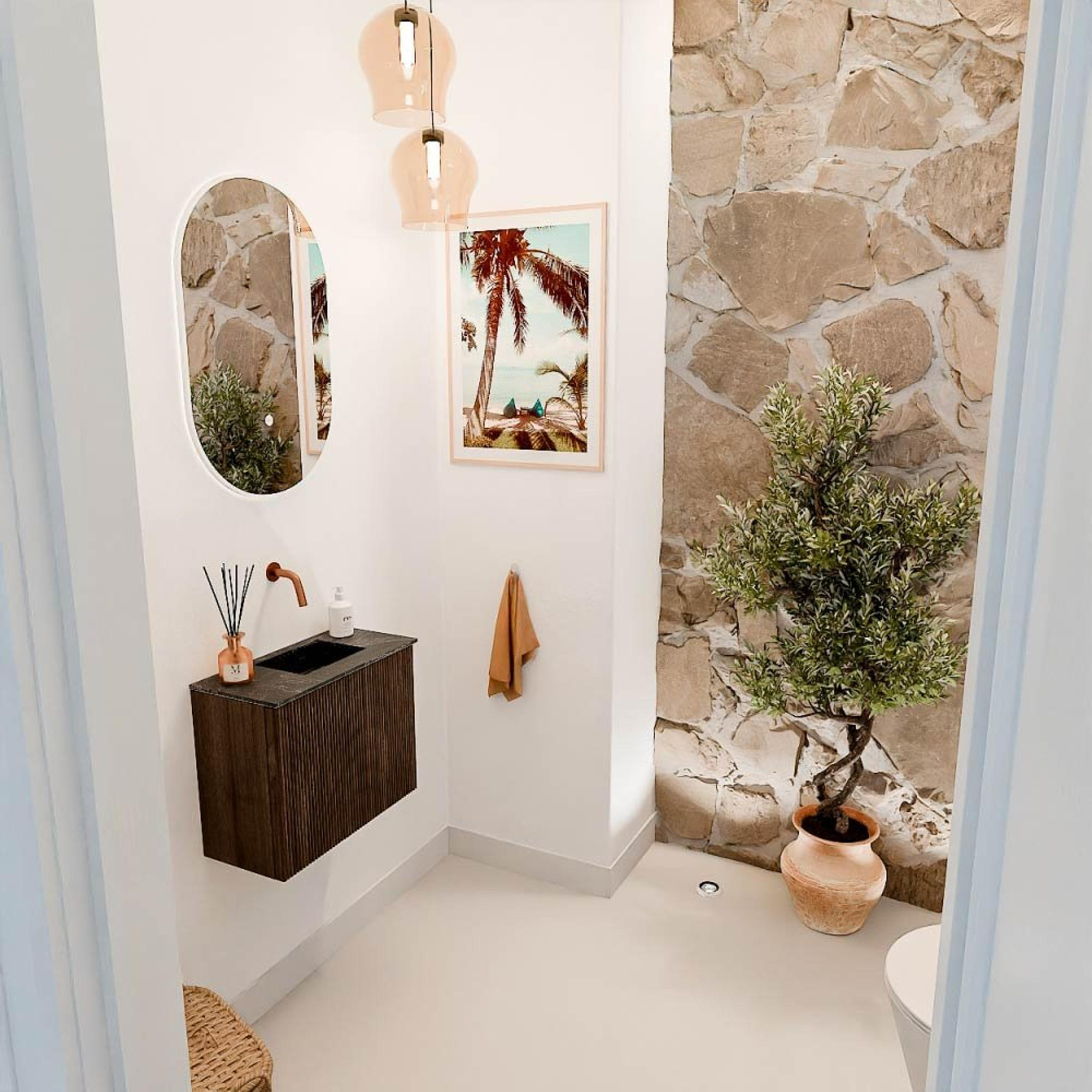 Cette solution compacte et élégante apporte immédiatement chaleur et caractère à votre salle de bains ou toilettes d'invités. Avec sa finition raffinée en noyer et le design subtil des rainures verticales, ce meuble transforme chaque espace en un lieu moderne et accueillant. Grâce à ses dimensions intelligentes de 50 cm de largeur, il s'adapte parfaitement aux petites salles de bains ou toilettes où vous ne souhaitez pas renoncer à l'ambiance et à la fonctionnalité. La vasque, avec la position du robinet à droite et sans trou de robinet pré-percé, vous donne la liberté de choisir vous-même le robinet qui correspond le mieux à votre style et à votre usage. Ce meuble est non seulement un plaisir pour les yeux, mais aussi un ajout pratique qui garde votre salle de bains propre et ordonnée, tout en conservant son charme grâce aux matériaux de haute qualité qui assurent une longue durée de vie.