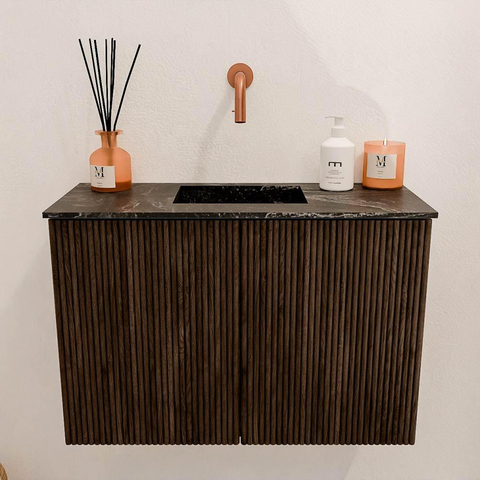La combinaison de chêne massif et de placage chêne dans une chaude couleur noyer confère à ce meuble une apparence naturelle et luxueuse. La structure à rainures verticales sur les façades ajoute un détail subtil mais remarquable, donnant au meuble une atmosphère unique et contemporaine. Il s'intègre ainsi sans effort dans divers styles d'intérieur, du moderne au classique. Avec ce meuble, vous apportez un élément stylé chez vous qui améliore immédiatement votre salle de bains et que vous apprécierez pendant des années.