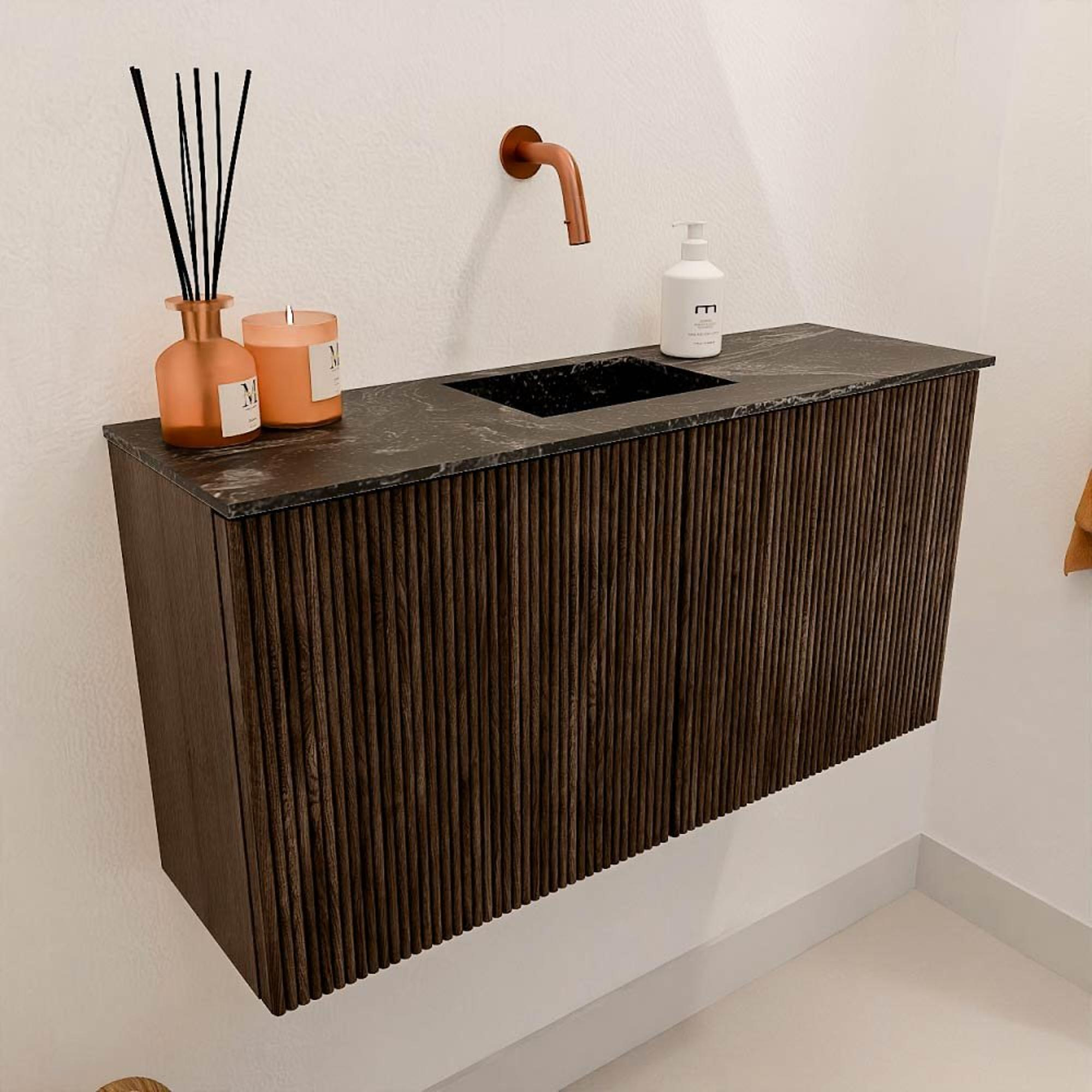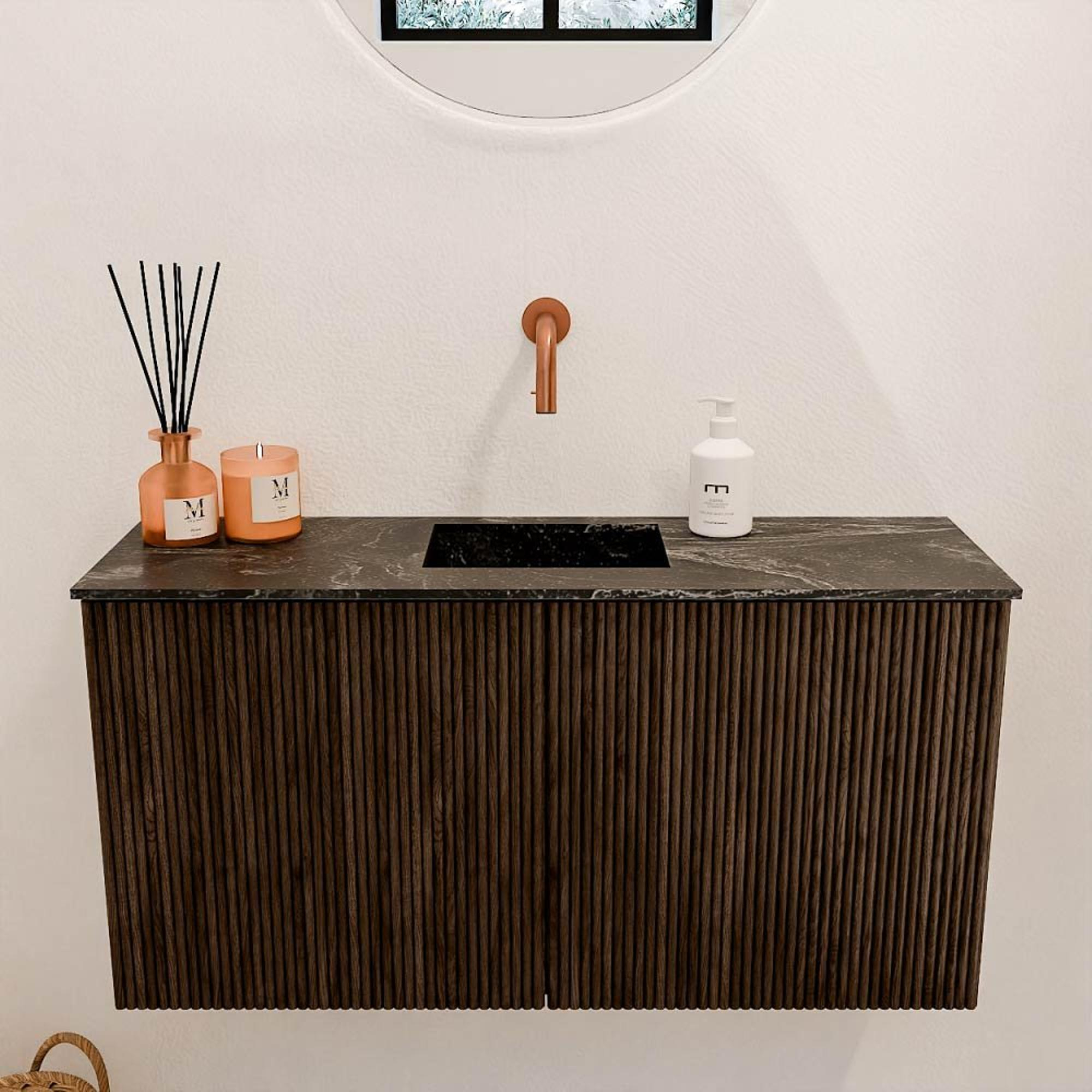 Le meuble se distingue immédiatement par sa couleur chaude noyer, qui donne à votre salle de bains une apparence naturelle et luxueuse. La combinaison avec la vasque de couleur Lava crée un contraste subtil qui dégage modernité et élégance. Ce design s'intègre facilement dans différents styles d'intérieur, du classique à l'industriel. Grâce aux lignes épurées et au caractère intemporel, le meuble reste un point de mire pendant des années. Ainsi, vous investissez dans une salle de bains qui impressionne non seulement maintenant, mais aussi à l'avenir.