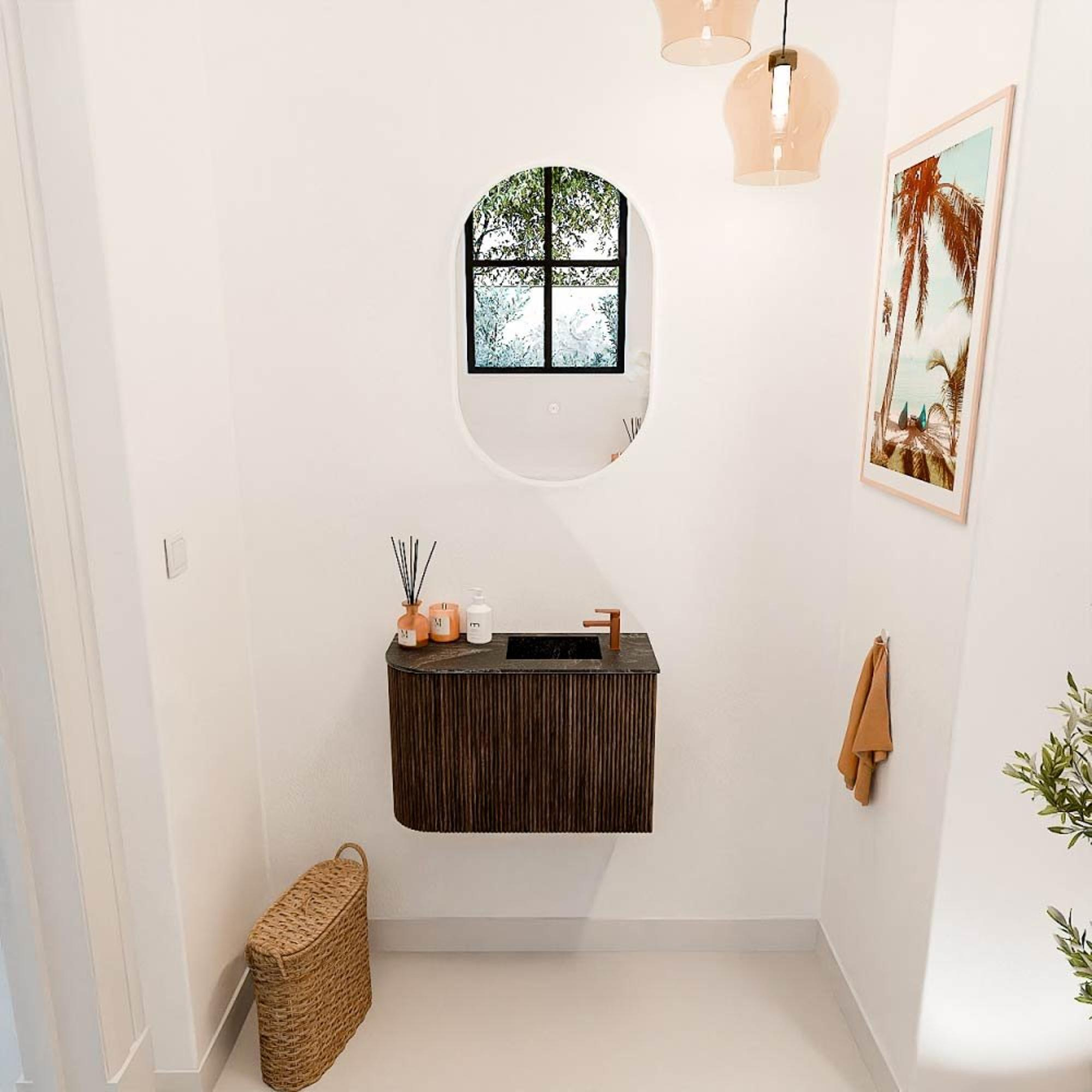 Transformez votre salle de bains avec un meuble qui n'est pas seulement pratique, mais qui ajoute aussi une ambiance chaleureuse et naturelle. Ce meuble élégant combine une magnifique couleur noyer avec un arrondi unique sur le côté gauche, ce qui en fait un véritable point focal dans chaque espace. La vasque, réalisée dans une couleur lave profonde et avec un trou de robinet pratique sur le côté droit, complète l'ensemble. Grâce à son design intelligent et ses matériaux de haute qualité, vous profitez d'un meuble de salle de bains à la fois fonctionnel et élégant. Que vous ayez un espace compact ou que vous cherchiez un endroit qui dégage du caractère, ce meuble s'adapte parfaitement et élève votre salle de bains à un niveau supérieur.