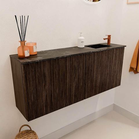 Le meuble se distingue immédiatement par la chaude couleur noyer et les rainures verticales sur la façade, qui lui confèrent un aspect exclusif et intemporel. Ce look bois naturel apporte une ambiance et du caractère à votre salle de bains, sans être trop chargé. La combinaison avec la vasque Lava apporte une touche contemporaine, ce qui fait que le meuble paraît à la fois classique et moderne. Il s'intègre ainsi facilement dans différents styles de salle de bains, du rustique à l'industriel.