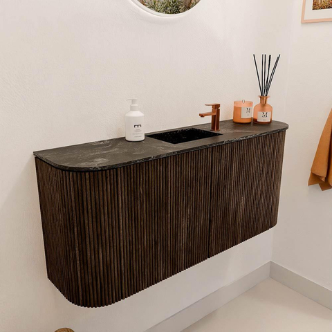 La chaude couleur noyer et les courbes élégantes font de ce meuble un véritable point focal. L’accent naturel du bois donne à votre salle de bains une allure luxueuse sans dominer. La combinaison avec la vasque couleur lava crée un contraste intéressant tout en restant apaisant. Ce meuble est conçu pour offrir à votre salle de bains une ambiance intemporelle et raffinée, où style et confort vont de pair. Ainsi, vous créez un espace où il fait bon commencer et terminer chaque journée.