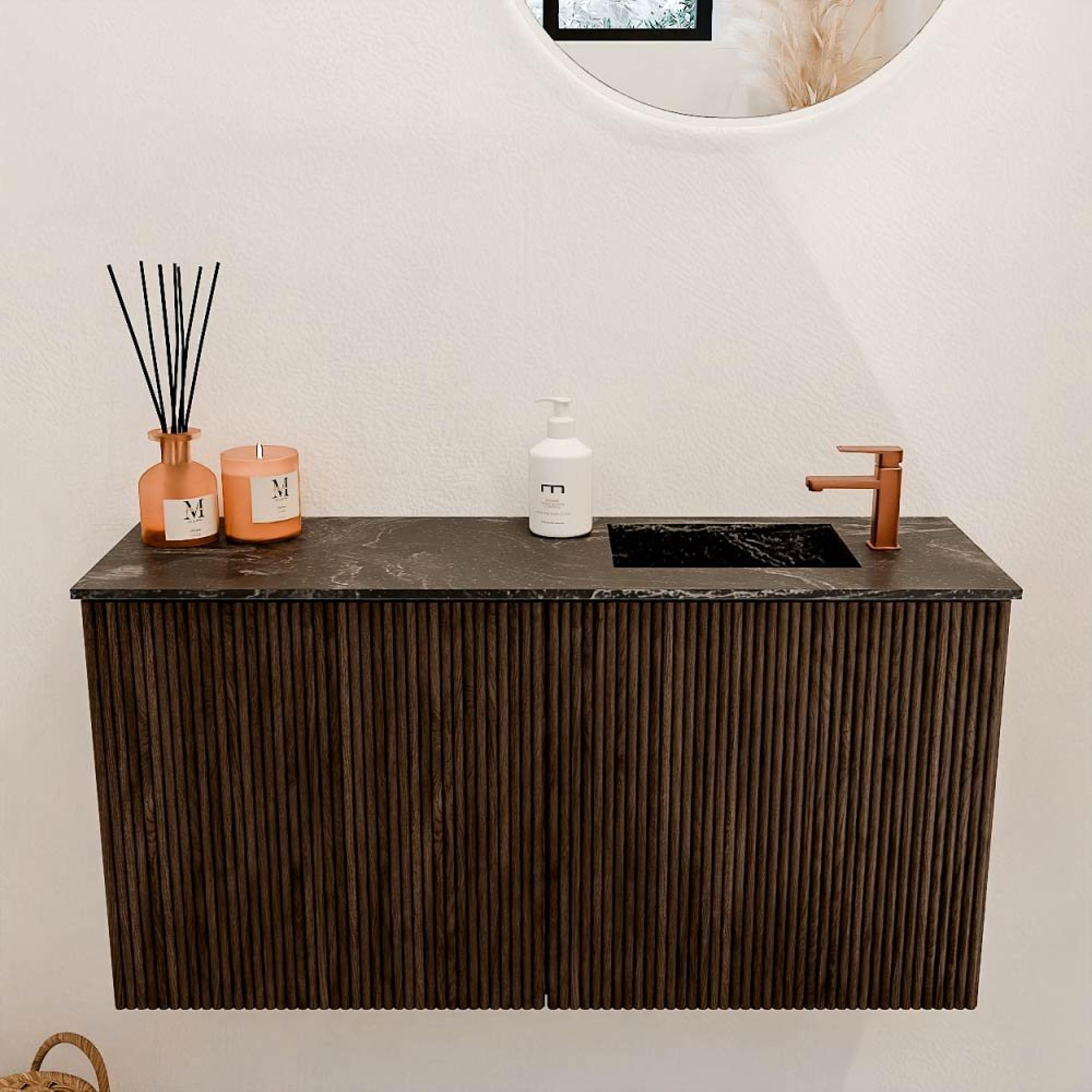 La couleur chaude noyer du meuble donne immédiatement à votre salle de bains un aspect luxueux et naturel. L'association avec la vasque couleur lave crée un contraste subtil qui attire l'attention sans dominer. Ce meuble est conçu avec un souci du détail, ce qui en fait un ajout intemporel qui s'adapte facilement à différents styles d'intérieur. Grâce à son design épuré et minimaliste, le meuble paraît moderne tout en restant accueillant. Vous créez ainsi une salle de bains qui n'est pas seulement fonctionnelle, mais aussi un endroit où vous aimez passer du temps.