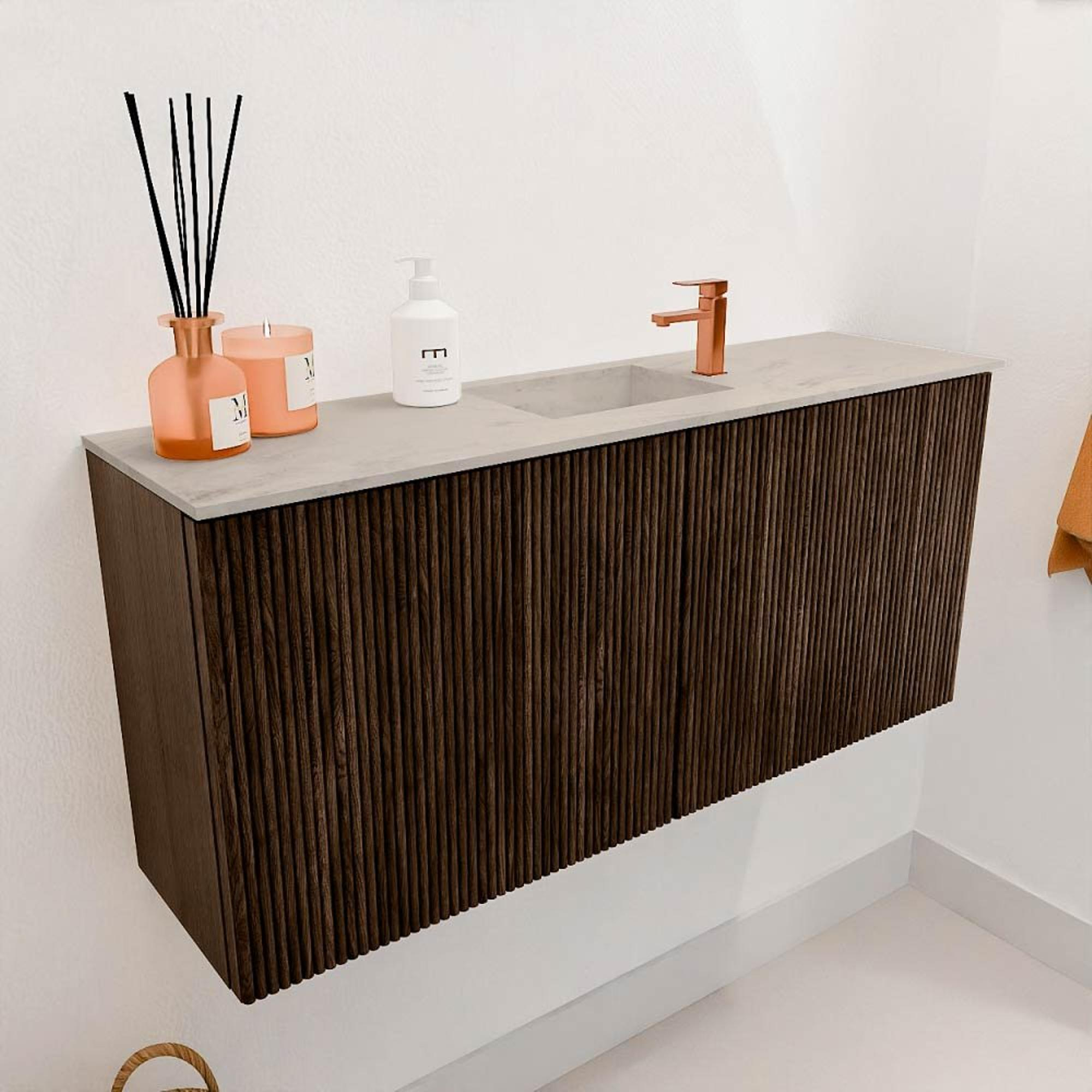 Transformez votre salle de bains avec ce magnifique meuble qui est non seulement pratique, mais qui apporte aussi une ambiance chaleureuse et naturelle. Grâce à la finition de haute qualité dans une riche couleur noyer et à la combinaison de chêne massif à l'avant avec du placage chêne sur les côtés, votre salle de bains obtient une atmosphère élégante et intemporelle. Le meuble est conçu avec un souci du détail et offre suffisamment d'espace de rangement derrière deux portes, afin que vous puissiez ranger tous vos accessoires de salle de bains proprement. La vasque fournie dans la douce couleur Opalo avec un trou de robinet complète l'ensemble et assure une apparence fraîche et lumineuse. Grâce à la possibilité de placer la vasque au milieu, le meuble s'adapte parfaitement à vos souhaits personnels et à l'agencement de votre salle de bains. Ce meuble est un choix intelligent pour ceux qui veulent combiner fonctionnalité et design sans effort.