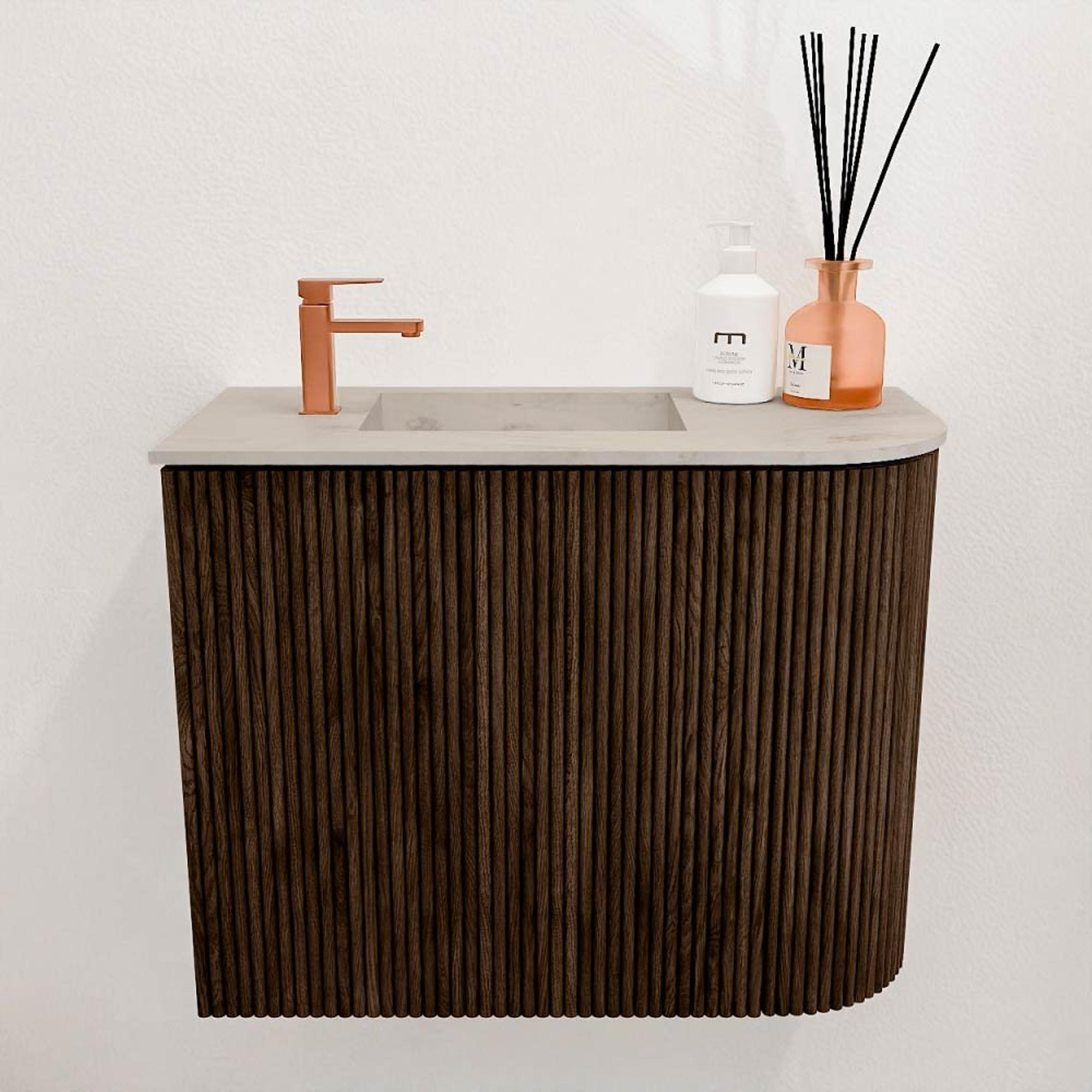Malgré ses dimensions compactes, ce meuble offre étonnamment beaucoup d'espace de rangement pour garder votre salle de bains propre et ordonnée. La vasque avec un trou de robinet à gauche est idéale pour un robinet simple et assure une disposition pratique. Grâce au côté droit arrondi, vous pouvez également placer le meuble dans des espaces petits ou étroits sans qu'il gêne. Cela en fait un choix intelligent tant pour des toilettes d'invités que pour une salle de bains compacte, où vous souhaitez optimiser chaque centimètre.