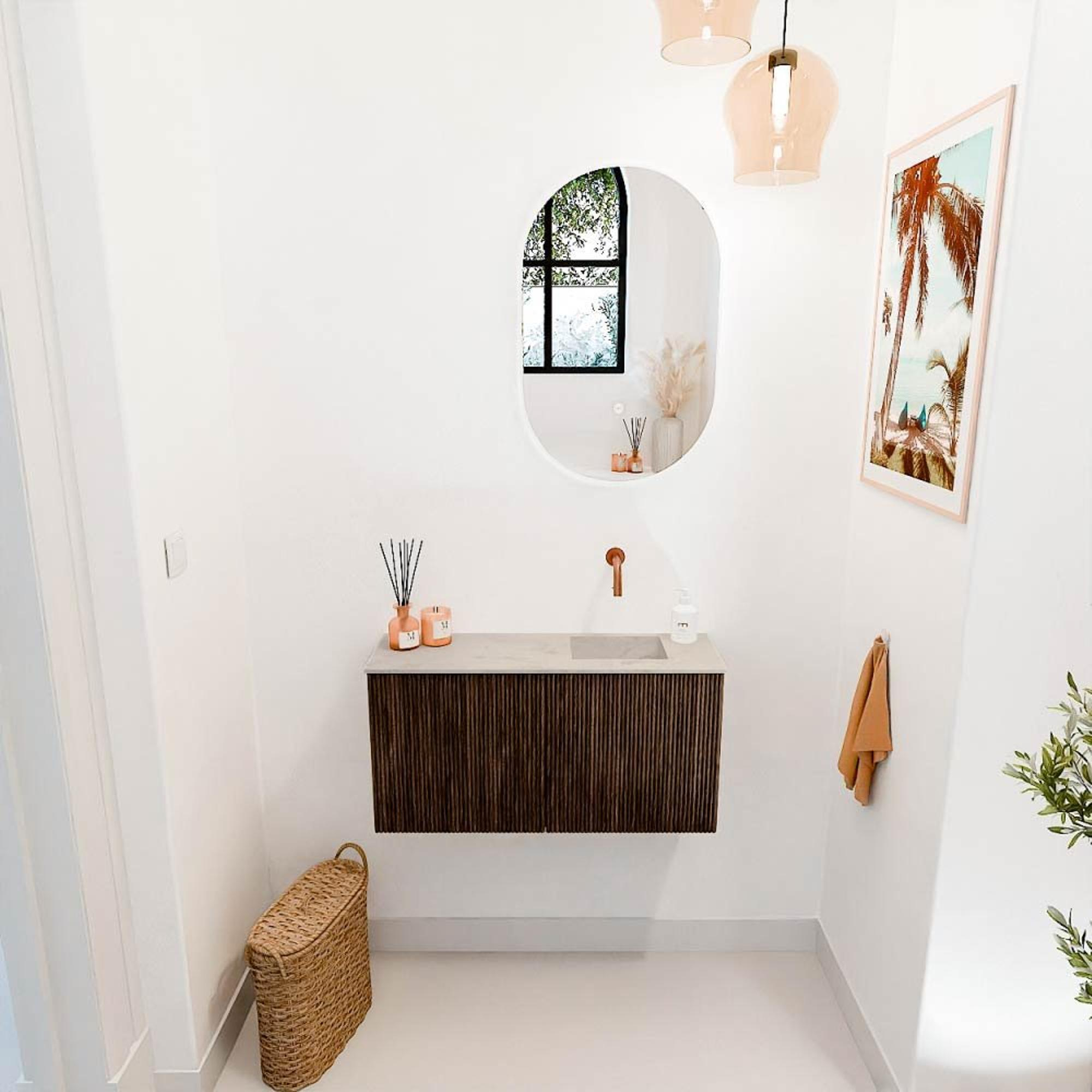 Avec ce magnifique meuble, vous donnez immédiatement à votre salle de bains une ambiance chaleureuse et naturelle. Il combine une couleur noyer élégante avec une vasque blanche opale, ce qui crée une atmosphère fraîche et moderne. Grâce à ses dimensions compactes de 80 cm de large et sa faible profondeur, ce meuble est parfait pour les petites salles de bains ou toilettes où vous ne voulez pas sacrifier le style et la fonctionnalité. La position droite de la vasque rend l'ensemble particulièrement pratique, tandis que l'absence de trou de robinet vous laisse la liberté de choisir le robinet qui correspond le mieux à vos souhaits. Ainsi, vous créez une salle de bains qui correspond parfaitement à votre goût personnel et à votre confort d'utilisation. Ce meuble est conçu pour transformer votre salle de bains en un lieu où vous commencez et terminez chaque jour avec plaisir.