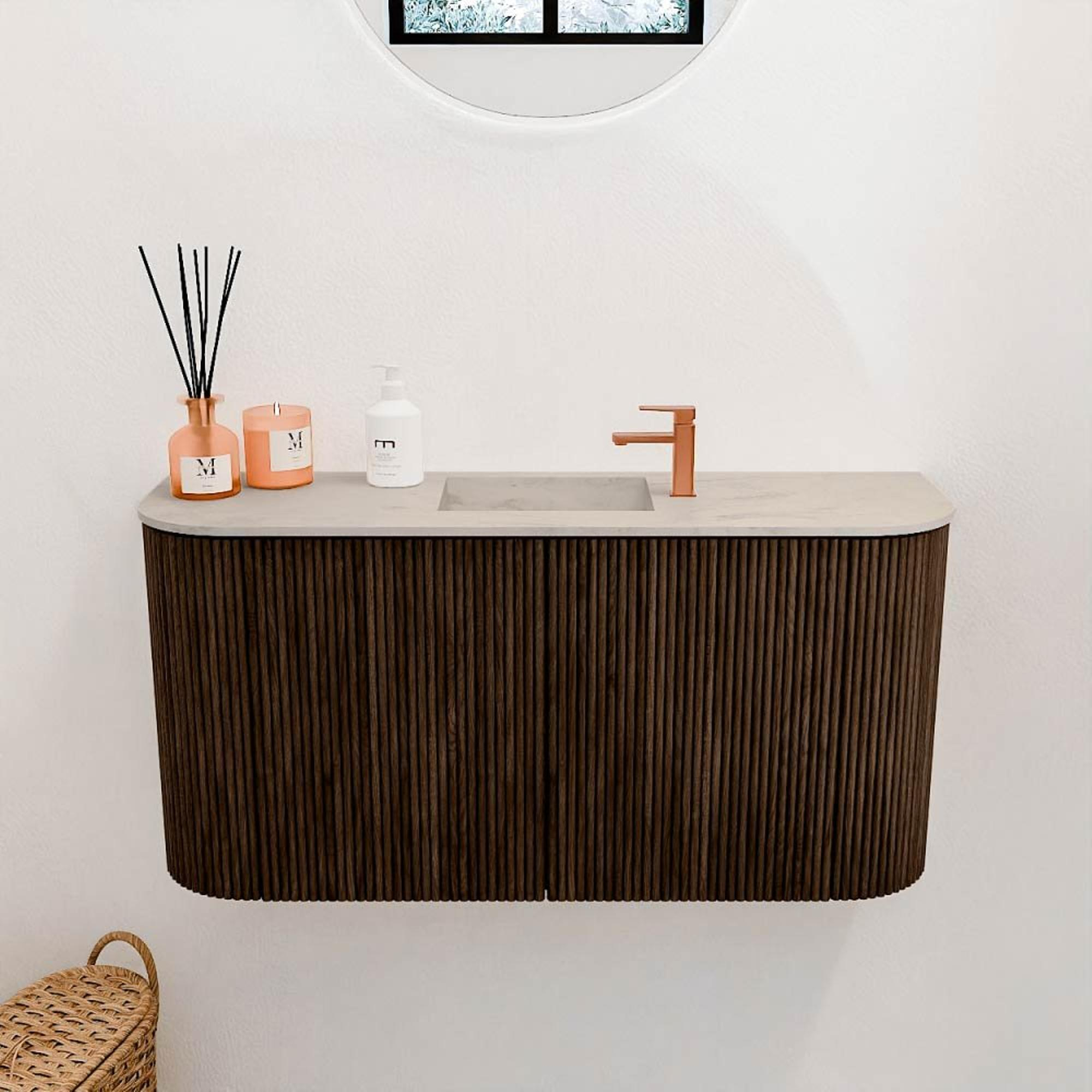 La combinaison d'une couleur noyer chaude et du grain naturel du bois crée une apparence élégante qui s'intègre sans effort dans toute salle de bains. Les rainures verticales dans le design donnent au meuble une touche moderne sans perdre le charme intemporel. Grâce aux coins arrondis des deux côtés, le meuble paraît plus doux et plus accueillant, contribuant à une atmosphère invitante. Ainsi, vous créez une salle de bains qui n'est pas seulement fonctionnelle, mais aussi un endroit où vous aimez passer du temps.