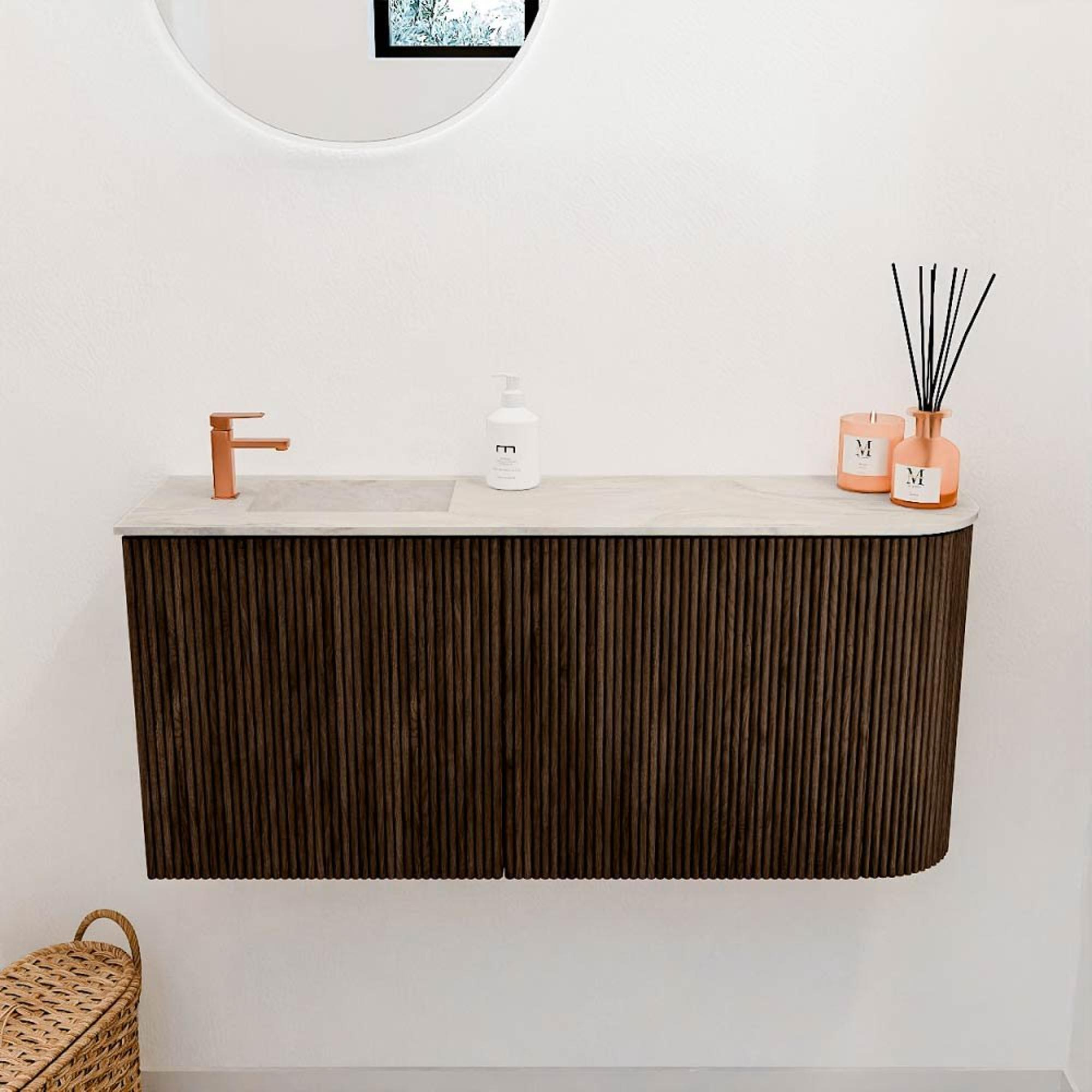 La couleur chaude noyer et le veinage naturel du bois offrent un aspect intemporel et élégant qui s'intègre facilement dans divers intérieurs de salle de bains. Le côté droit arrondi donne au meuble un caractère unique et le rend visuellement attrayant sans être dominant. Ce meuble ajoute une touche de luxe à votre salle de bains, sans être trop ostentatoire. Ainsi, vous profitez chaque jour d'une salle de bains qui est non seulement belle, mais qui invite aussi à la détente.