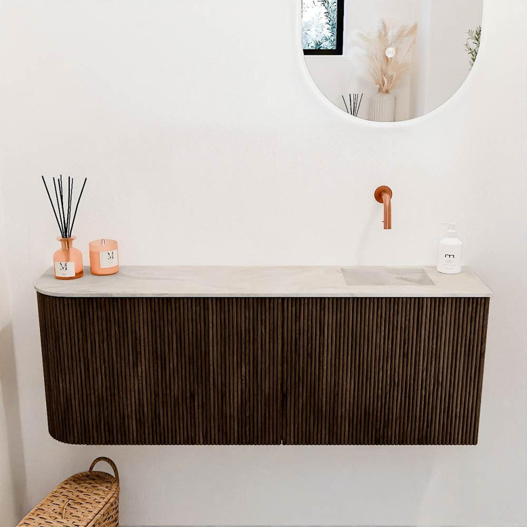 Mondiaz JOYA-DLUX 111.6cm meuble de salle de bains - arrondi gauche couleur Noyer - Vasque FAYE position Droite Sans trou de robinet couleur Ostra.