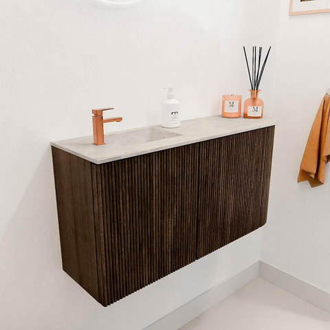 Mondiaz JOYA-DLUX Meuble de salle de bains - 81,6cm - arrondi droit couleur Walnut - Vasque FAYE position Gauche 1 trou de robinet couleur Ostra.