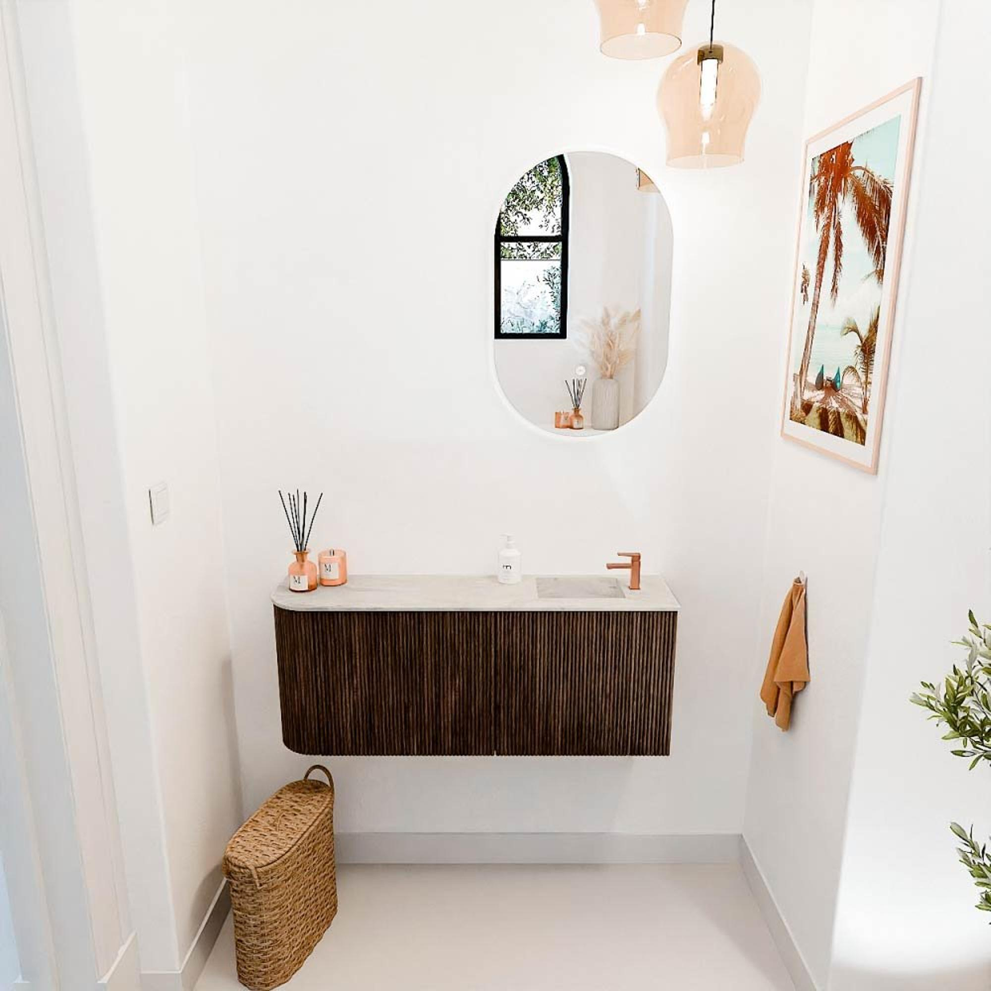 La combinaison de chêne massif et de placage de chêne dans une couleur chaude noyer donne à ce meuble une apparence intemporelle et élégante. L'arrondi subtil sur le côté gauche rend le design unique et assure une transition fluide dans votre intérieur de salle de bains. Grâce au contraste de couleur soigneusement choisi entre le meuble et la vasque Ostra, une atmosphère harmonieuse se crée, dégageant calme et classe. Ce meuble est un véritable accroche-regard qui donne à vos toilettes une apparence haut de gamme sans dominer.