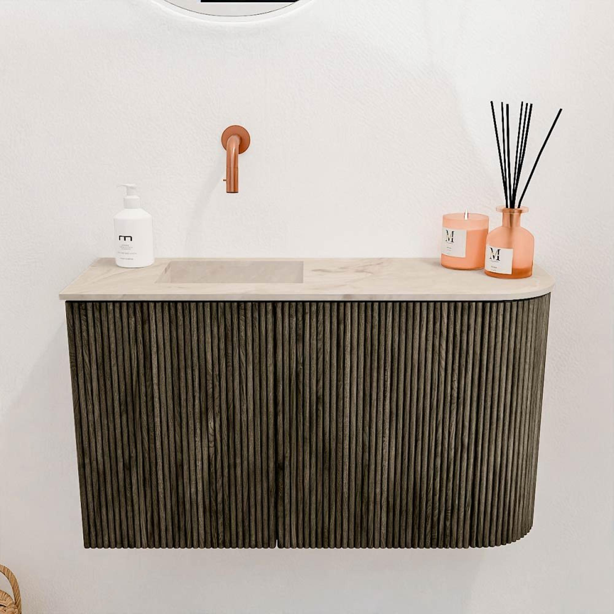 Avec ses lignes épurées et l'arrondi unique à droite, ce meuble est un véritable accroche-regard. La couleur Shadow offre un aspect moderne mais chaleureux qui s'harmonise facilement avec différents styles de salle de bains. En combinaison avec la vasque Frappe, un contraste subtil se crée, dégageant calme et élégance. Ce meuble ajoute immédiatement de l'ambiance et donne à votre salle de bains un aspect soigné et contemporain. Vous profitez ainsi d'un espace qui n'est pas seulement fonctionnel, mais invite aussi à la détente.Durable